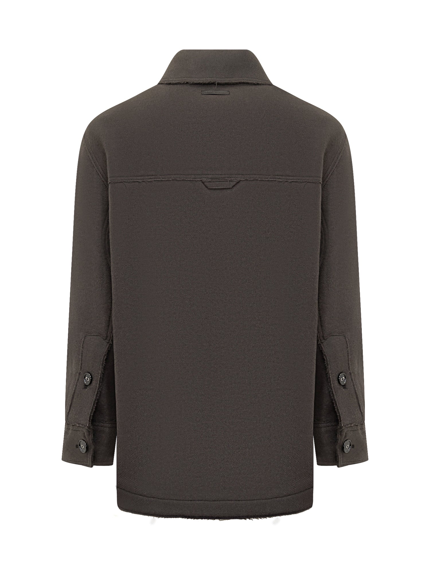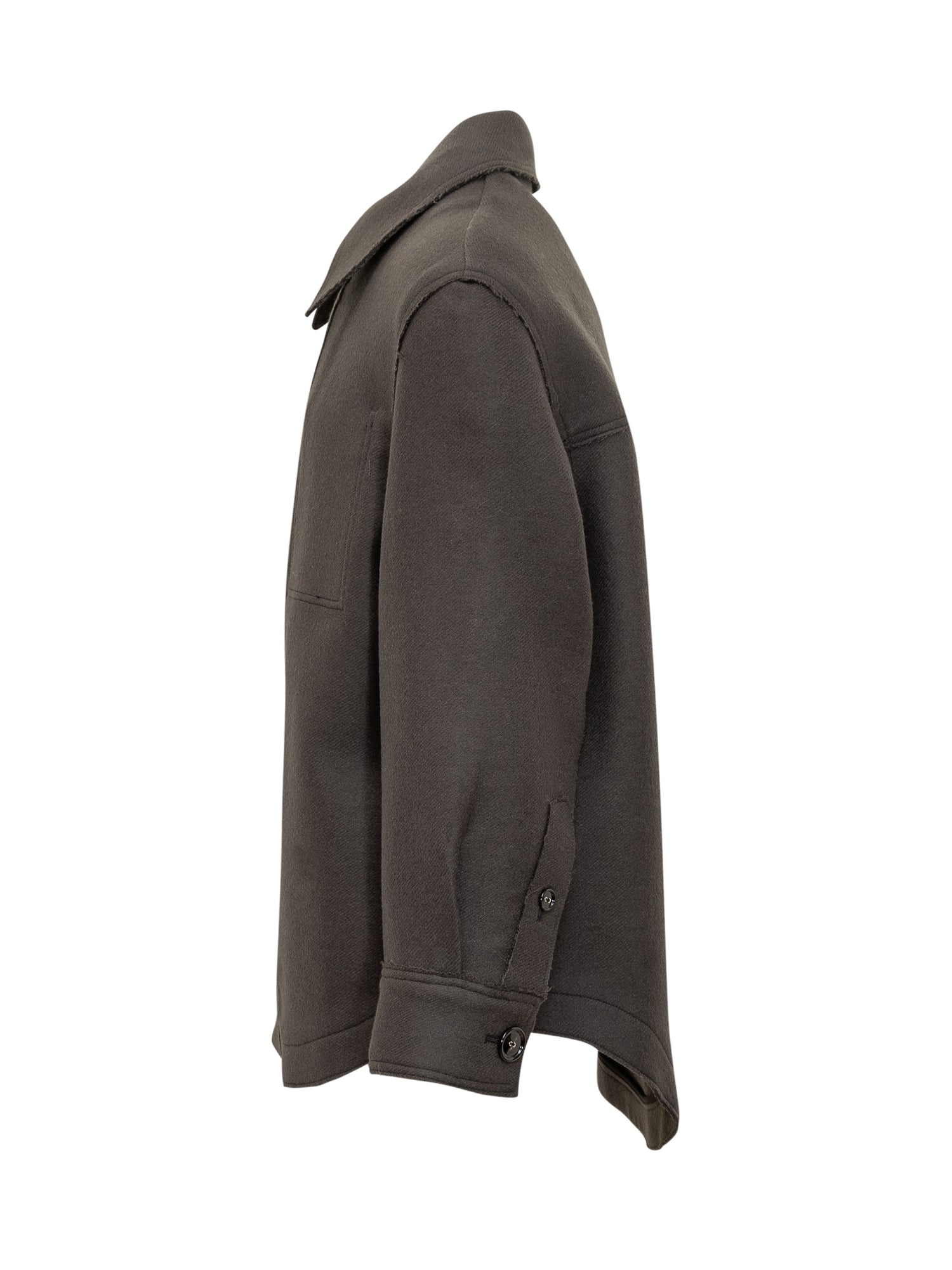 Overshirt Ami Alexandre Mattiussi in lana grigio scuro con bottoni frontali, taschino sul petto e bordi rifiniti a taglio vivo.