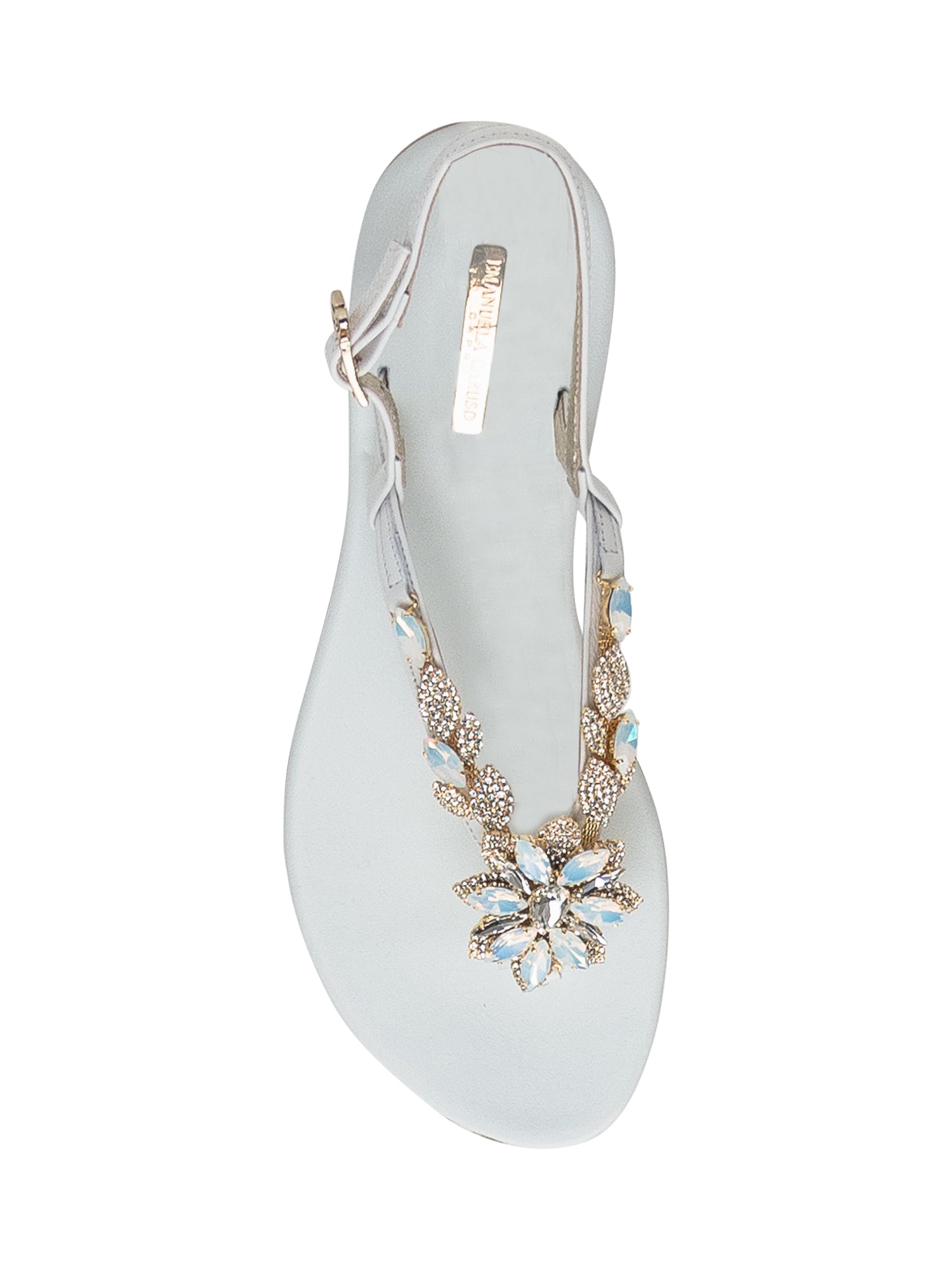 Sandalo infradito spine di pesce rafia. Sottopiede rivestito. Pietre multicolor su tomaia nappa azzurro xeno.