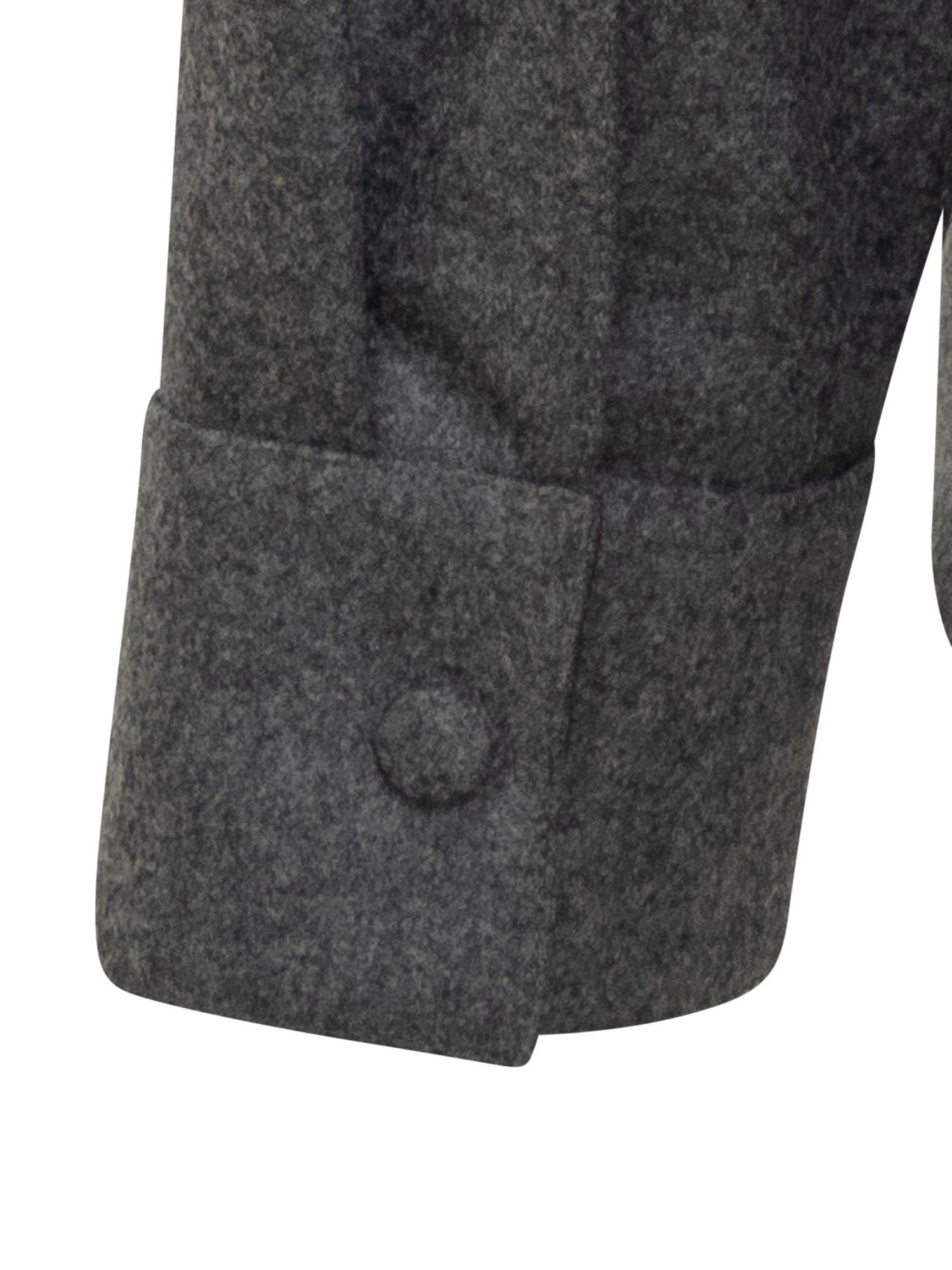 Giacca in lana grigia con chiusura a bottoni a pressione, tasche frontali e colletto classico.