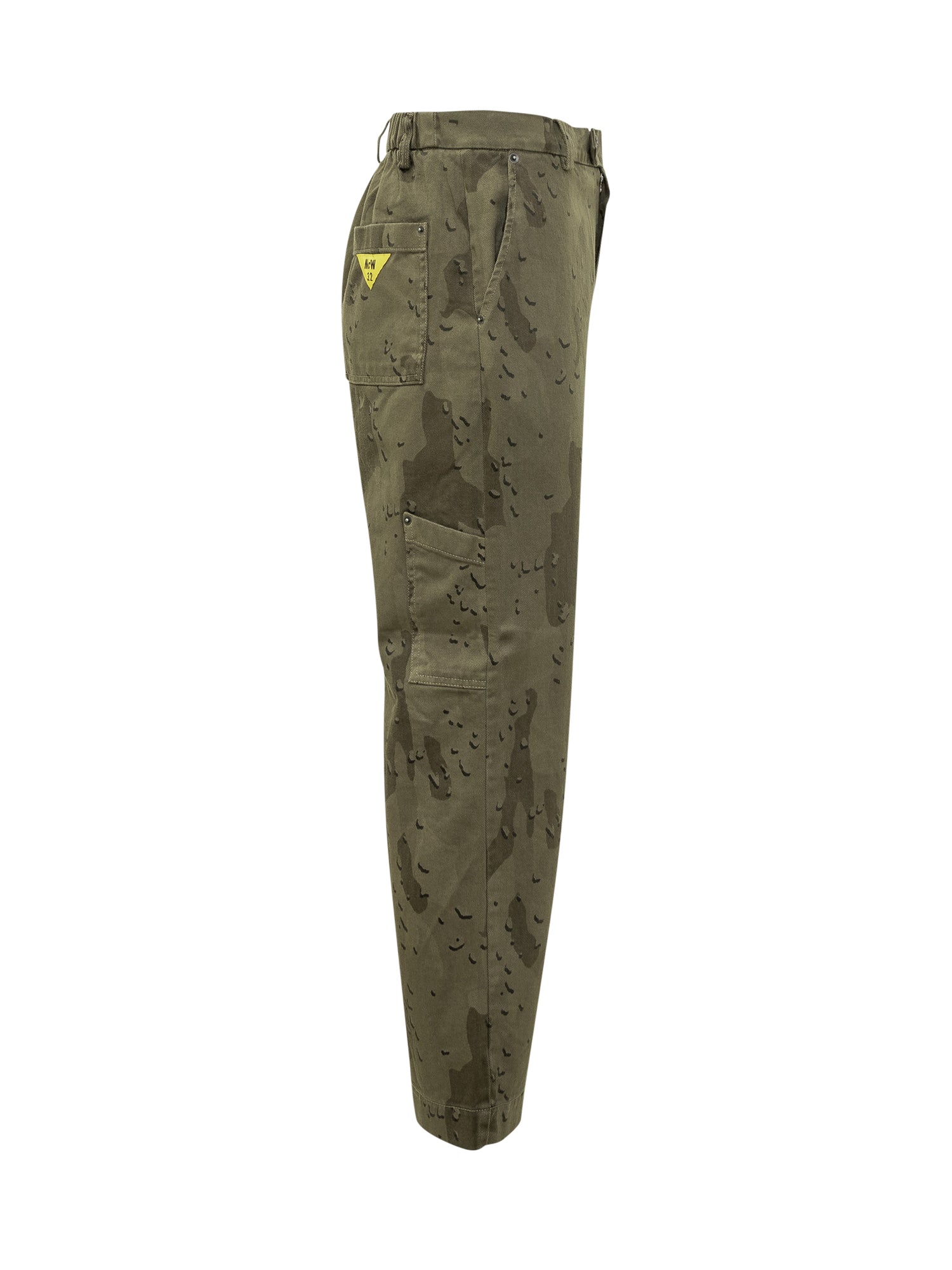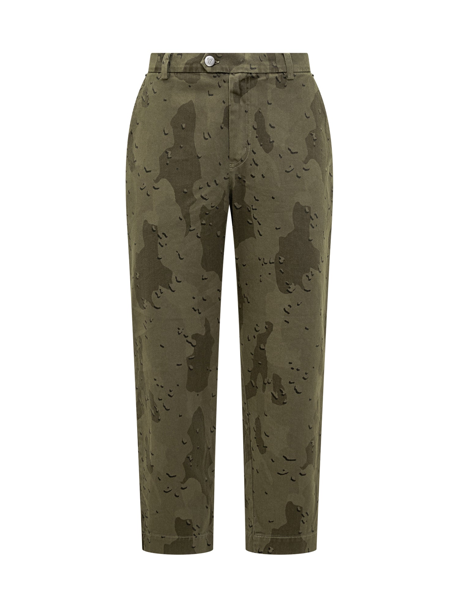 Chiusura con bottone e zip. Pantaloni Maison Crazy Worker verde militare con stampa camouflage. Modello cargo con tasche laterali e fit dritto.