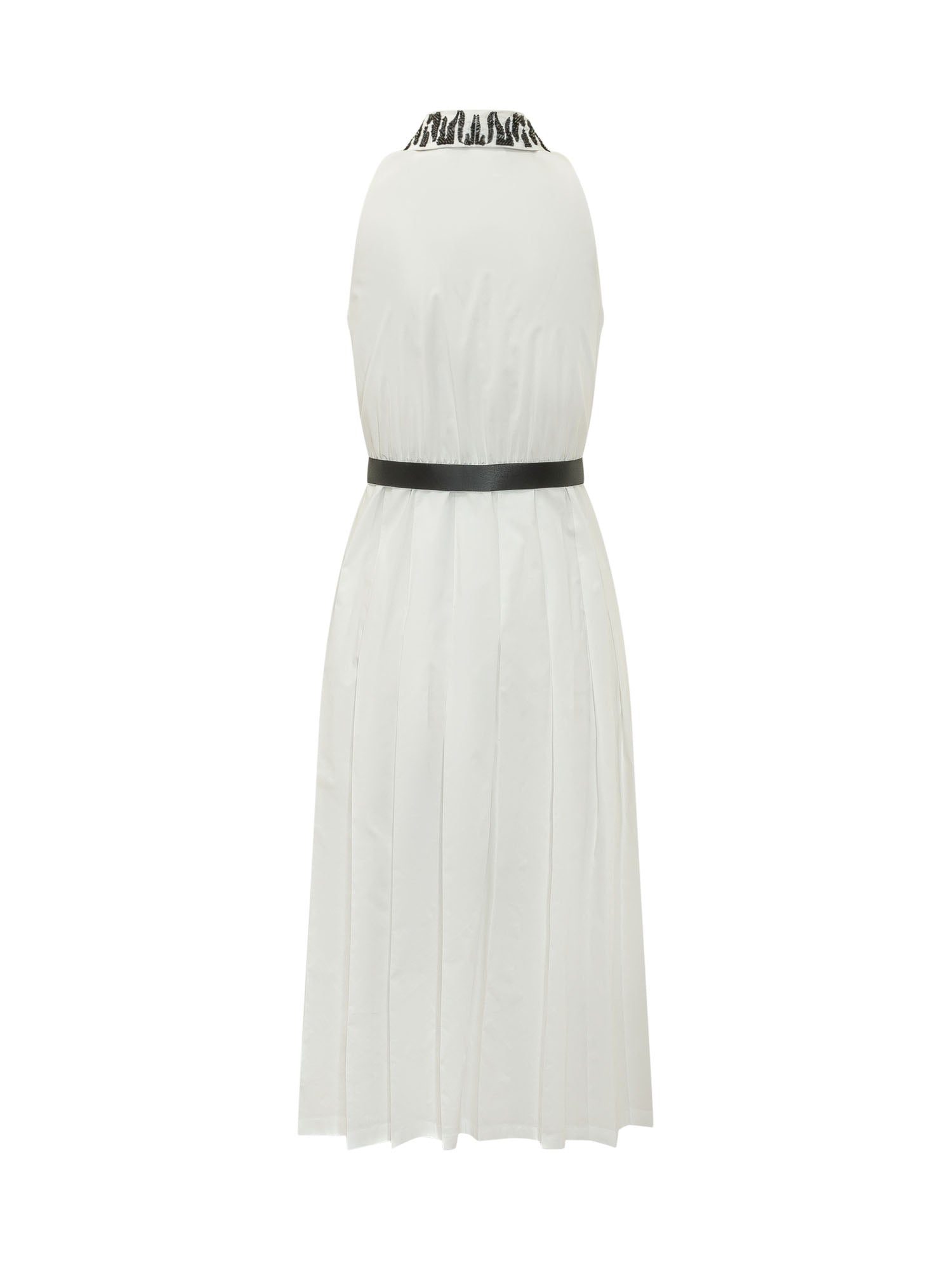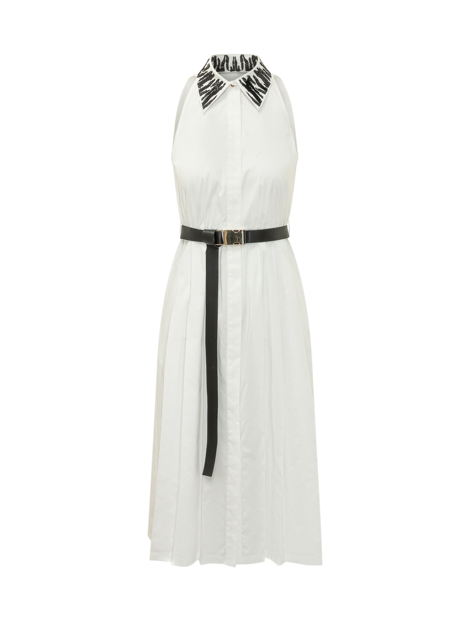 Abito lungo senza maniche con collo alto, cintura e chiusura frontale.