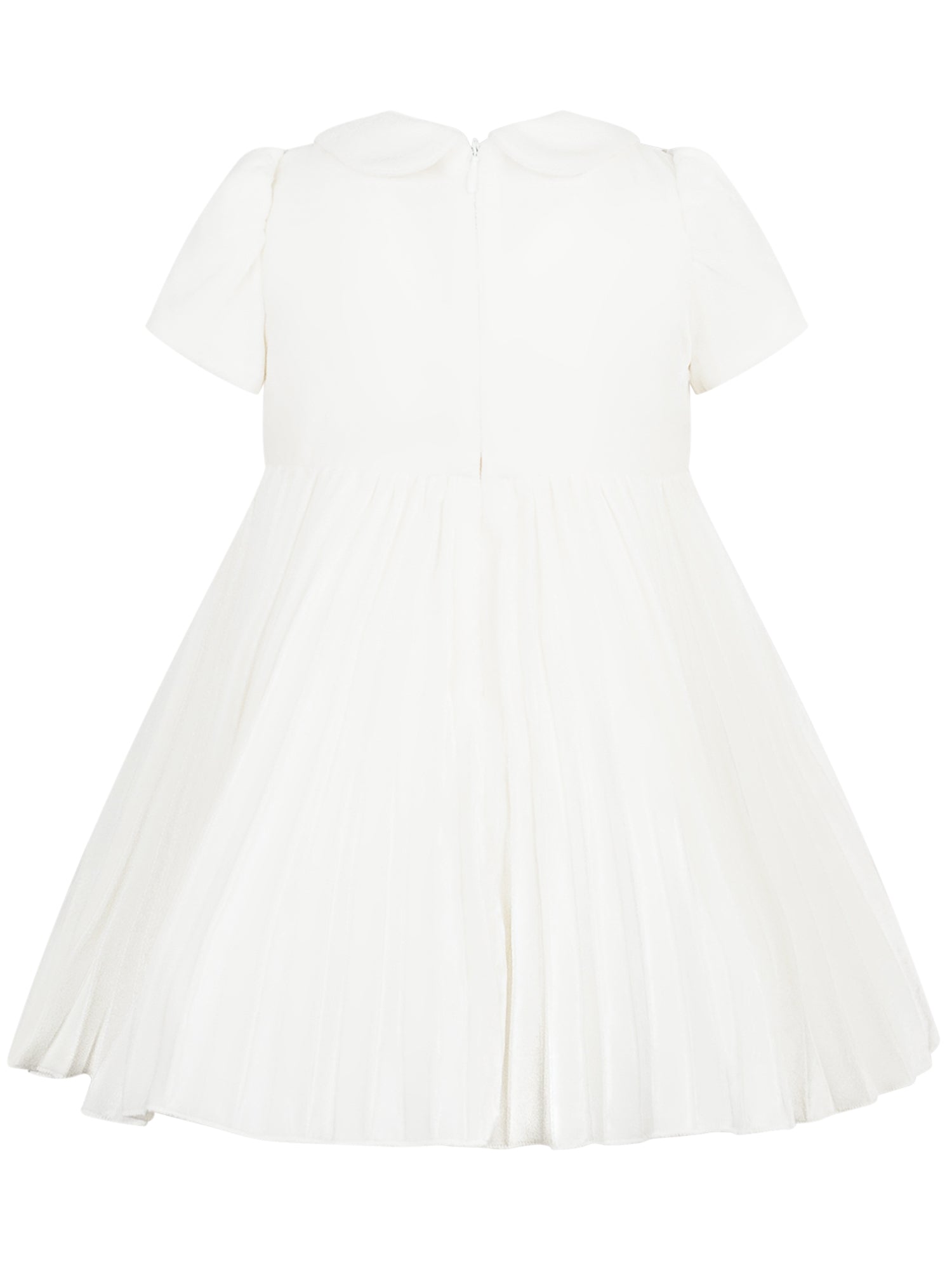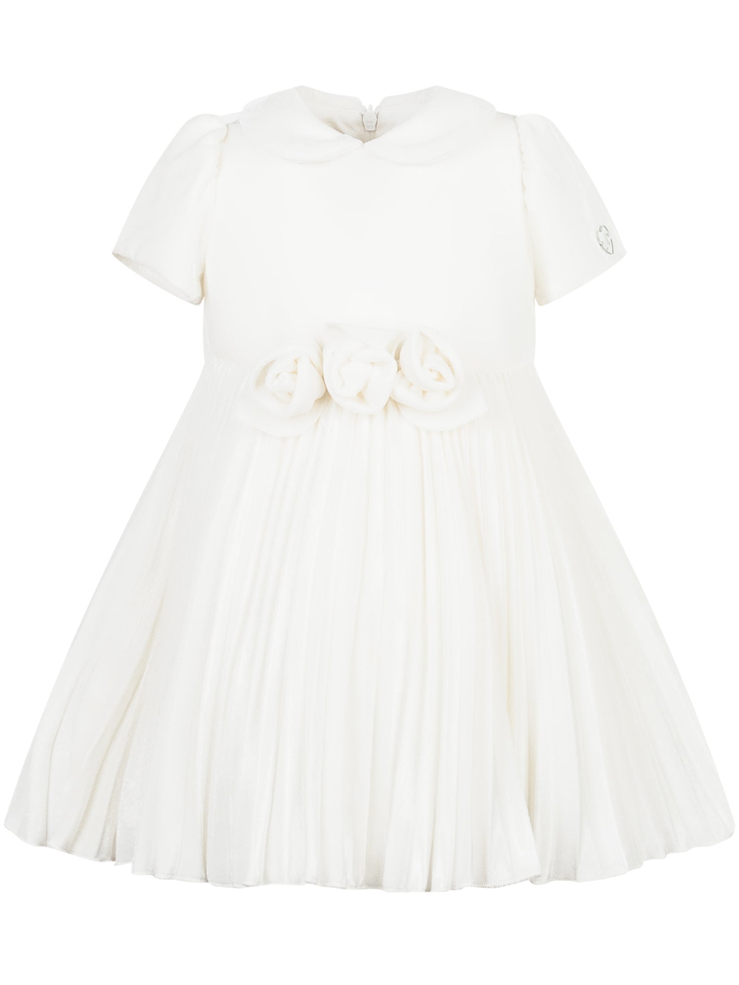 Abito Monnalisa bianco con maniche corte, colletto tondo e dettagli di rose in vita. La gonna plissettata dona movimento e raffinatezza.
