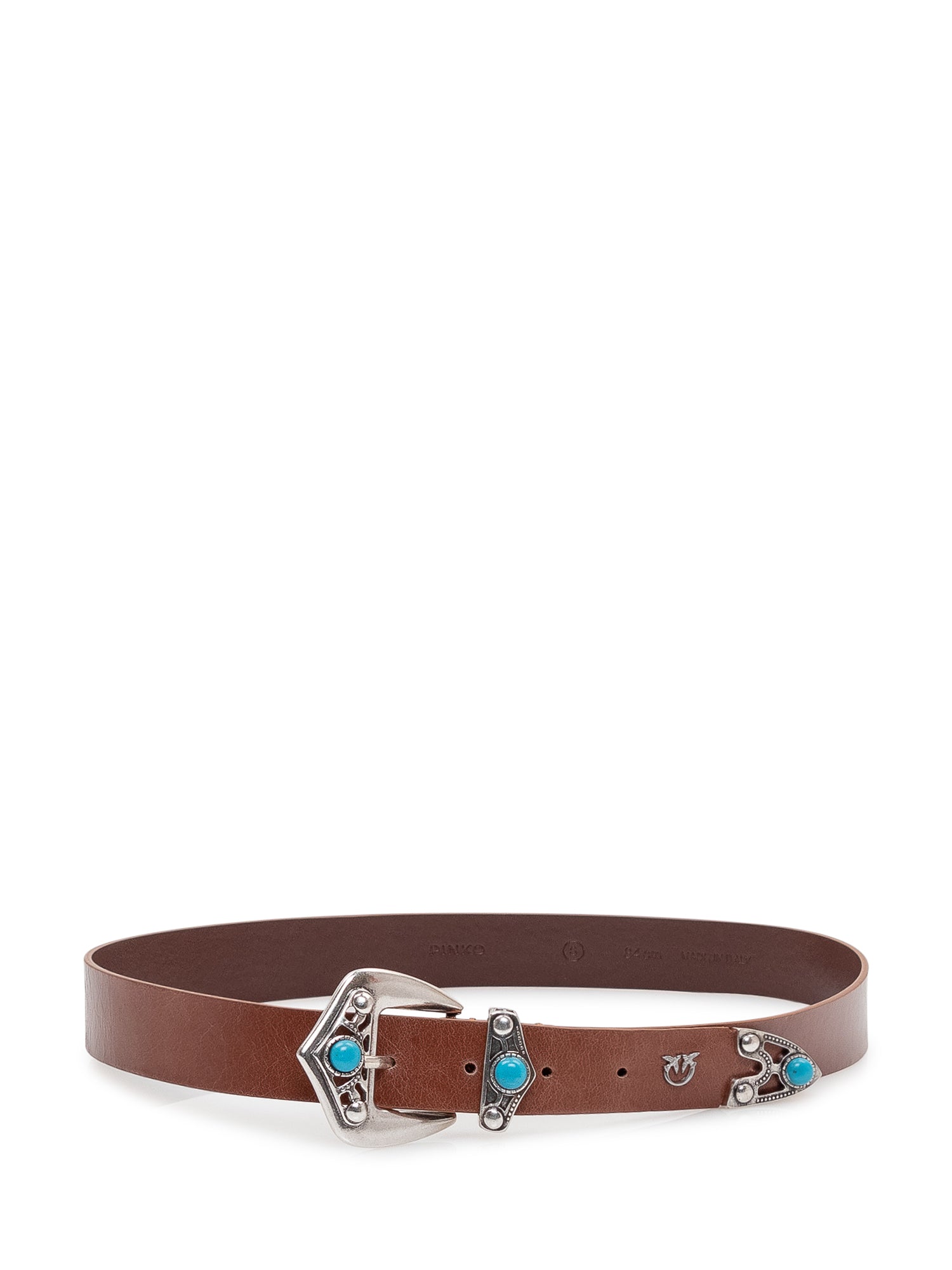 Cintura con fibbia decorativa incisa e inserti metallici applicati lungo la fascia. Design regolabile con fori.