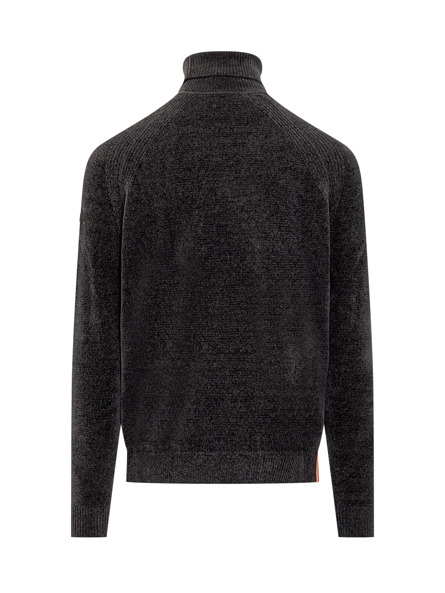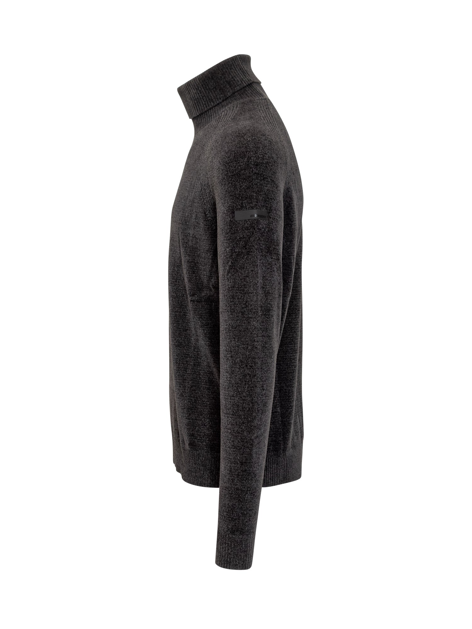 Maglione collo alto. Orli a costine. Logo sulla manica.