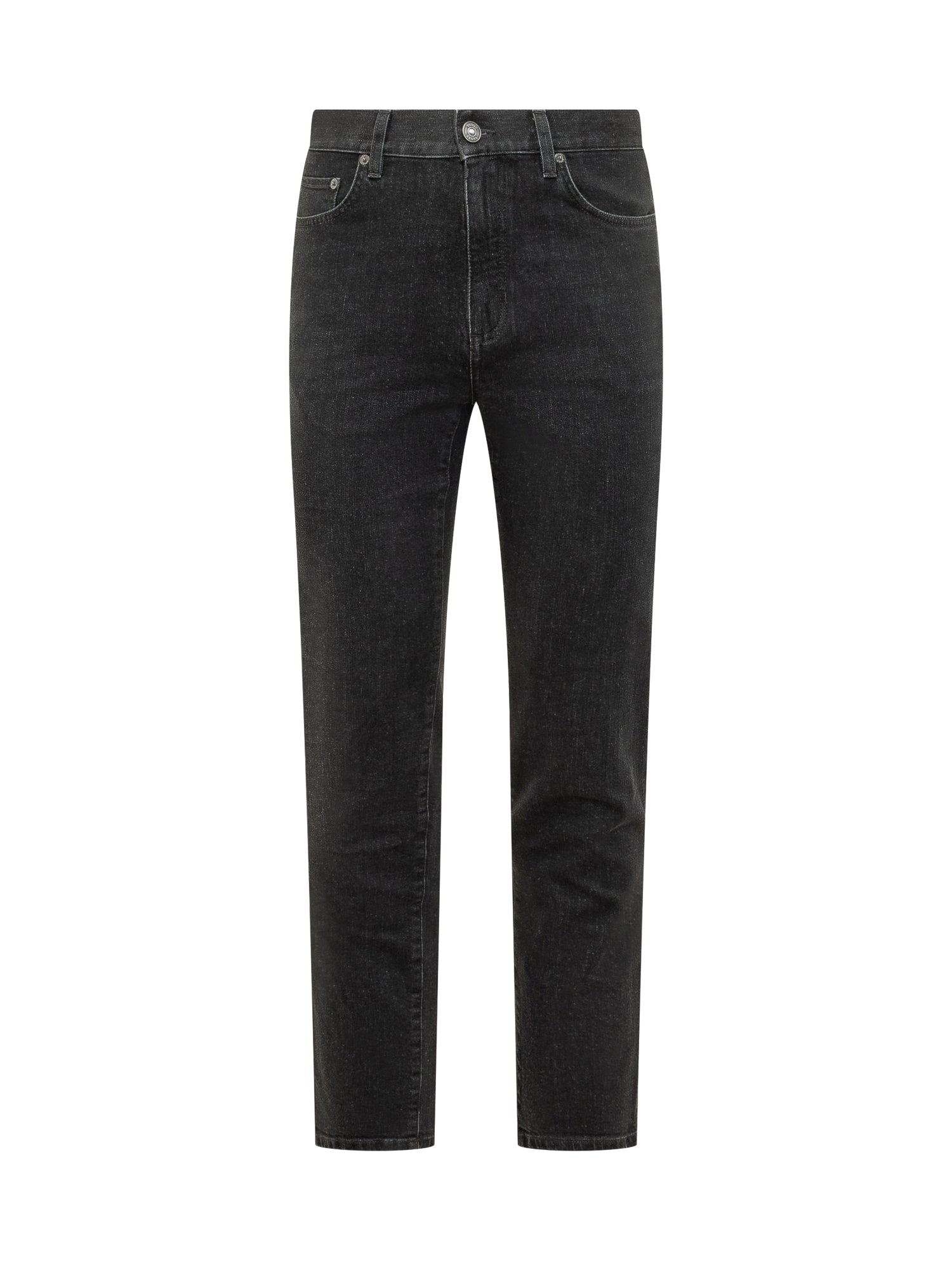 Jeans a cinque tasche con vestibilità regolare, passanti per cintura e chiusura con bottone e zip.