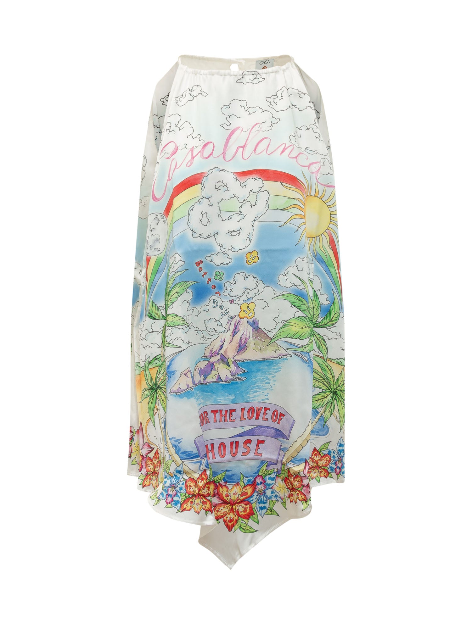 Abito con scollo all americana e linea fluida, stampa grafica all over con elementi paesaggio e lettering decorativo, design leggero e distintivo