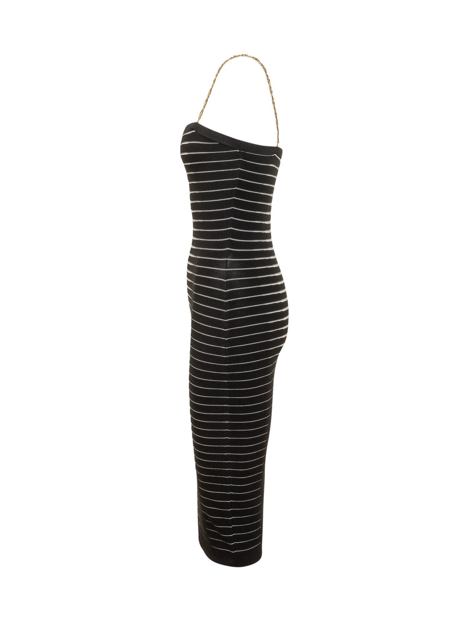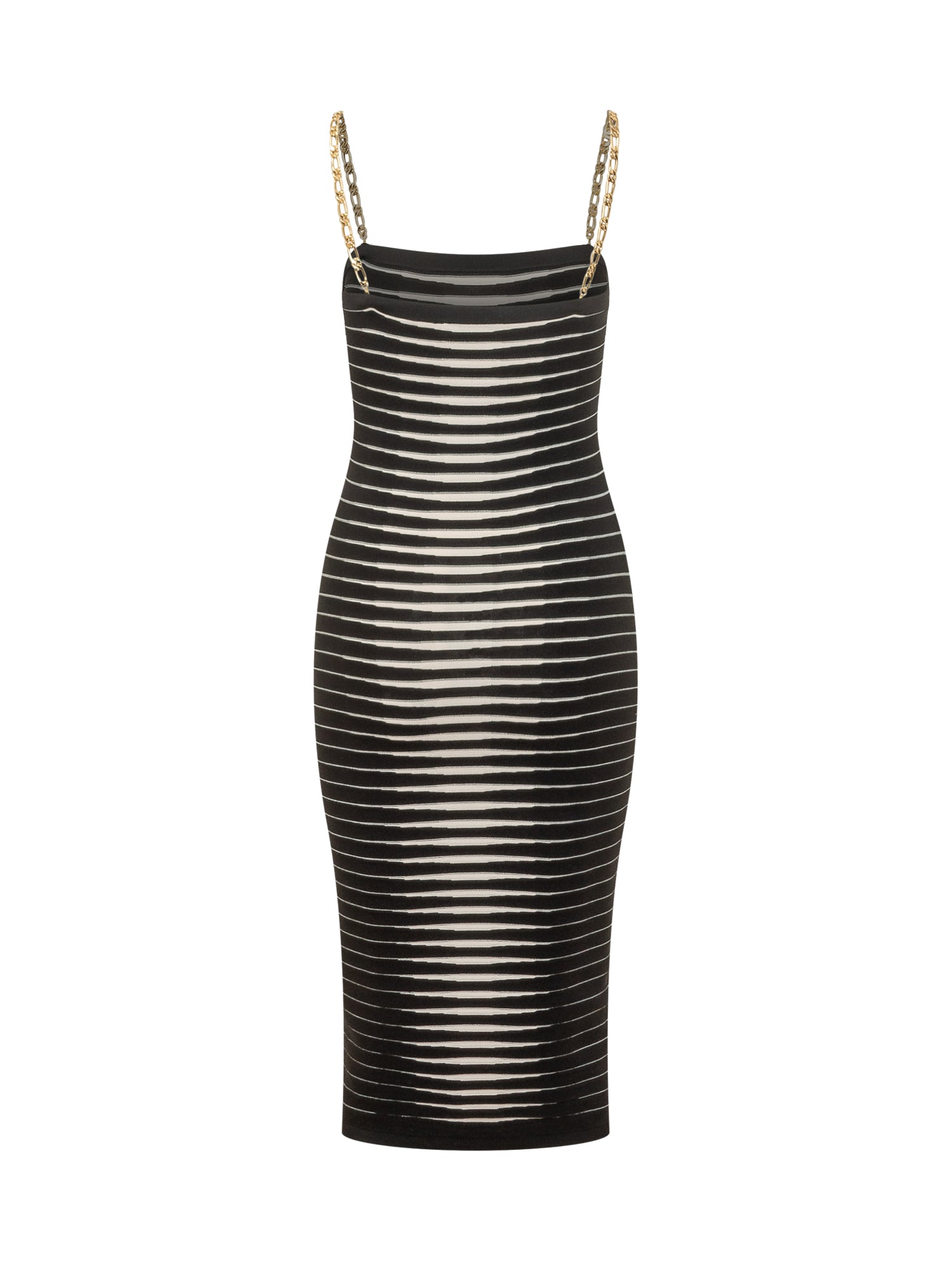 Abito di maglia con scollo dritto e spalline a catena. Linea aderente con motivo a righe all over e lunghezza midi. Design strutturato adatto a look distintivi.