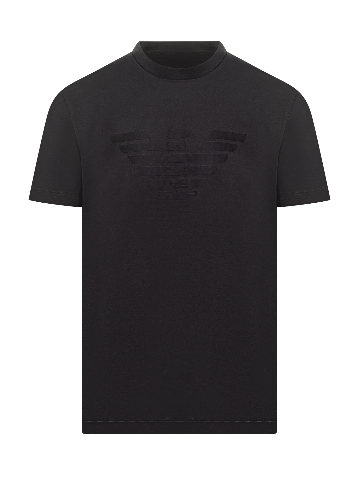 T-shirt nera Emporio Armani da uomo in cotone con iconico logo aquila tono su tono.