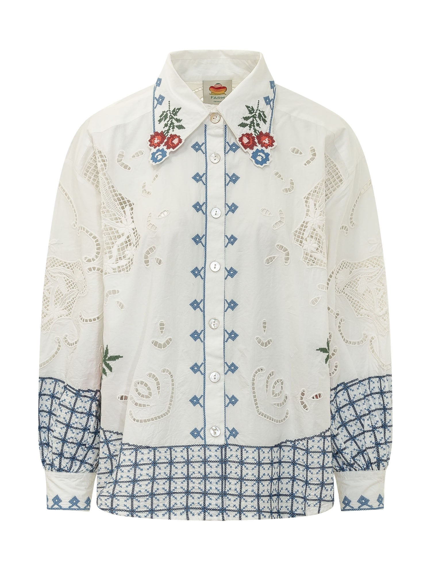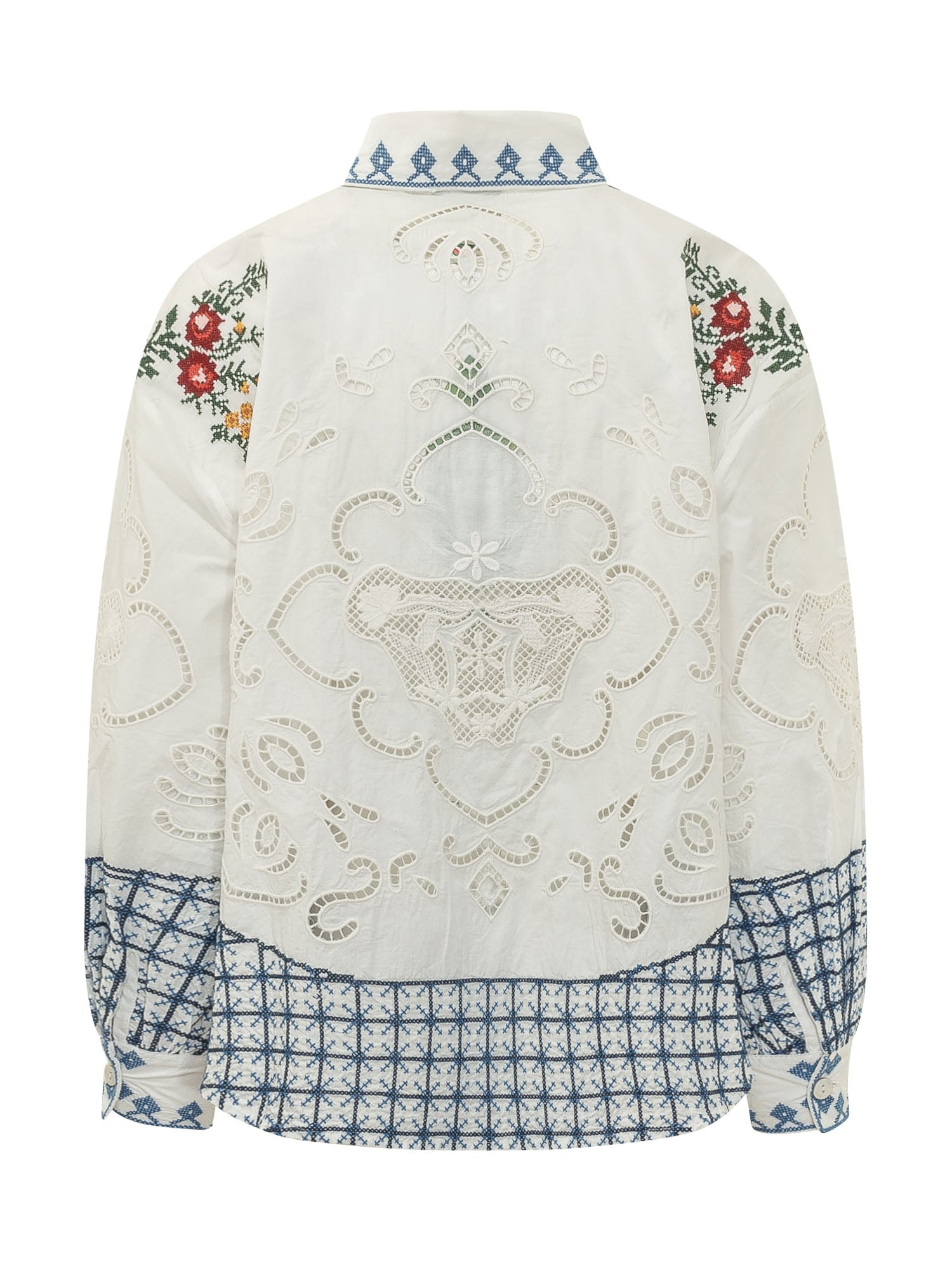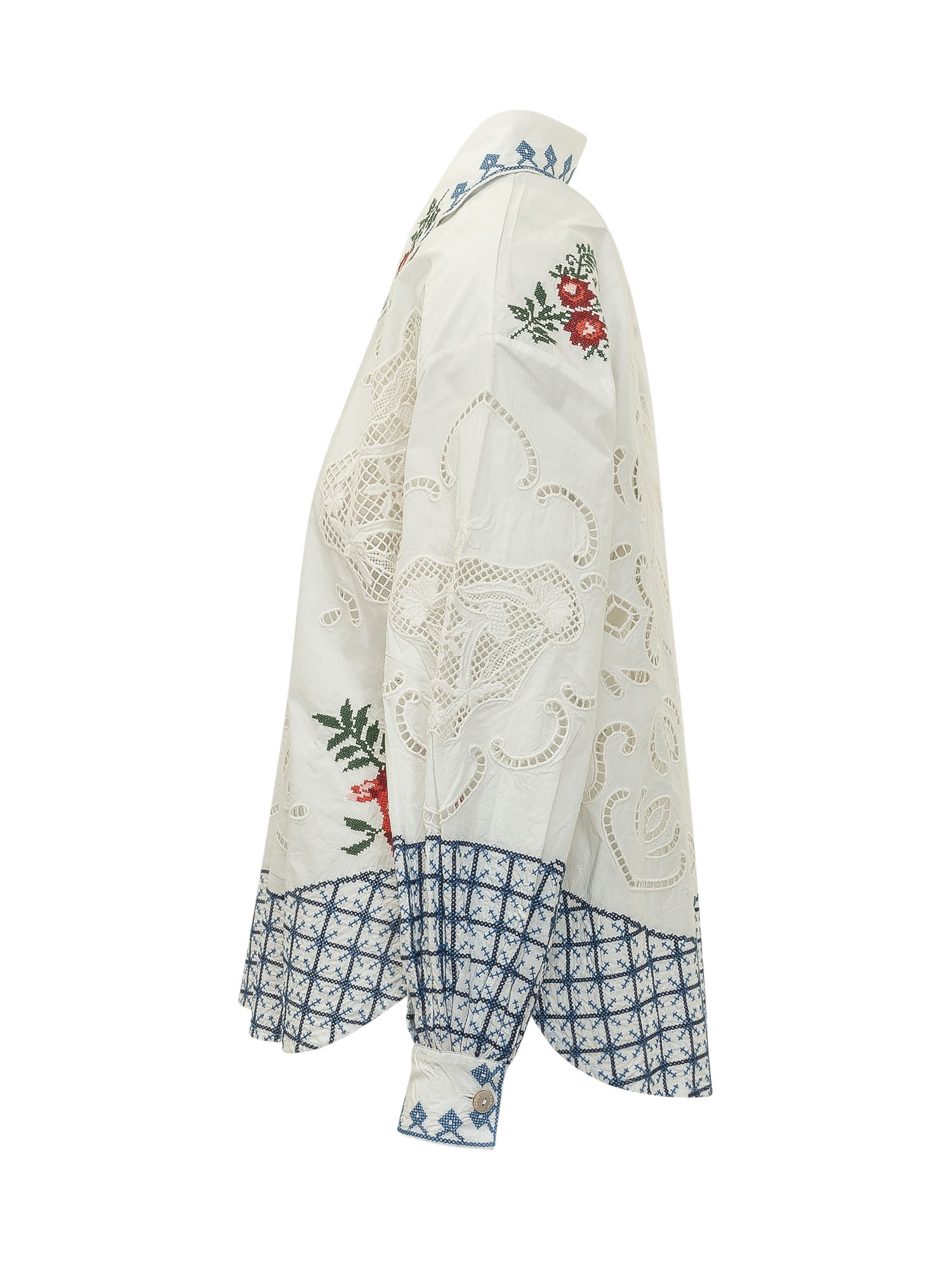 Camicia con maniche lunghe, chiusura frontale con bottoni, ricami traforati e dettagli floreali sul colletto