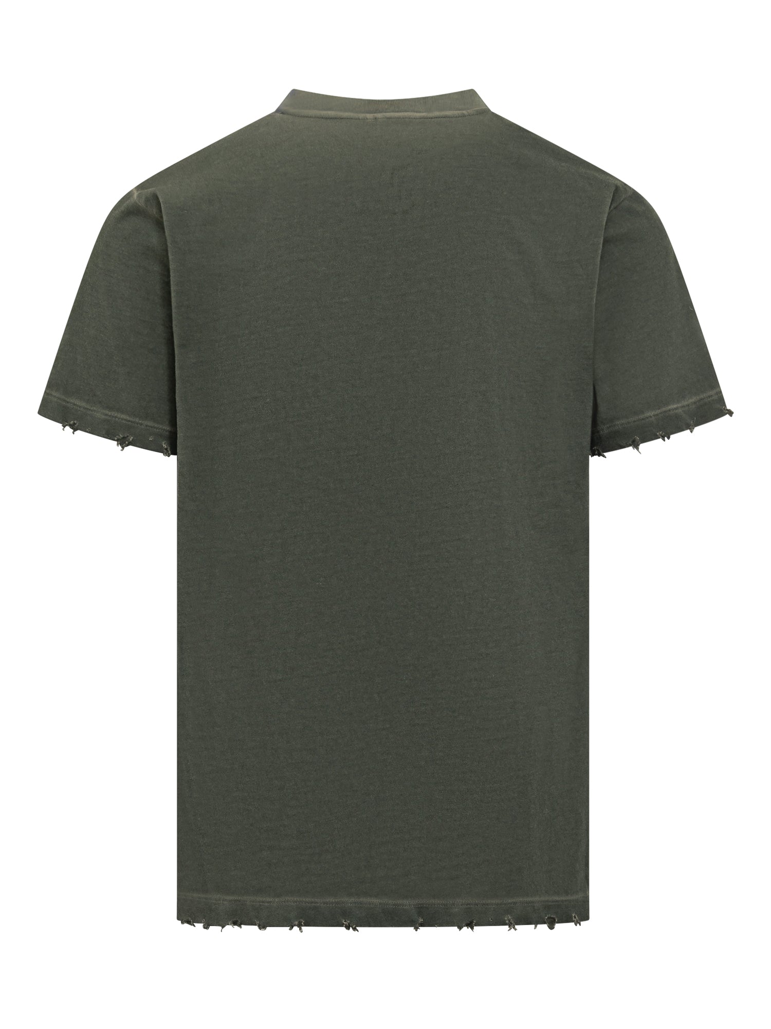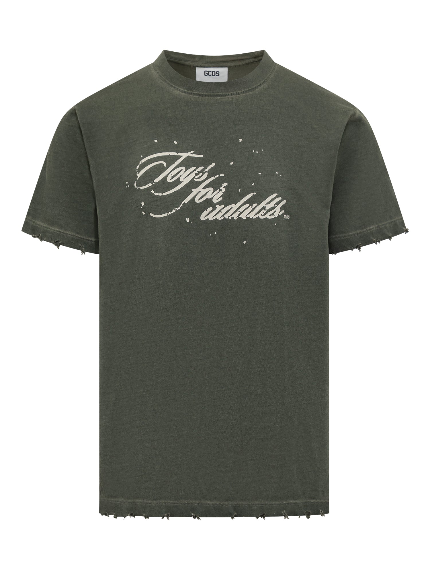 T-shirt in cotone con stampa frontale Toys e finiture vissute. Vestibilità casual e design grafico.