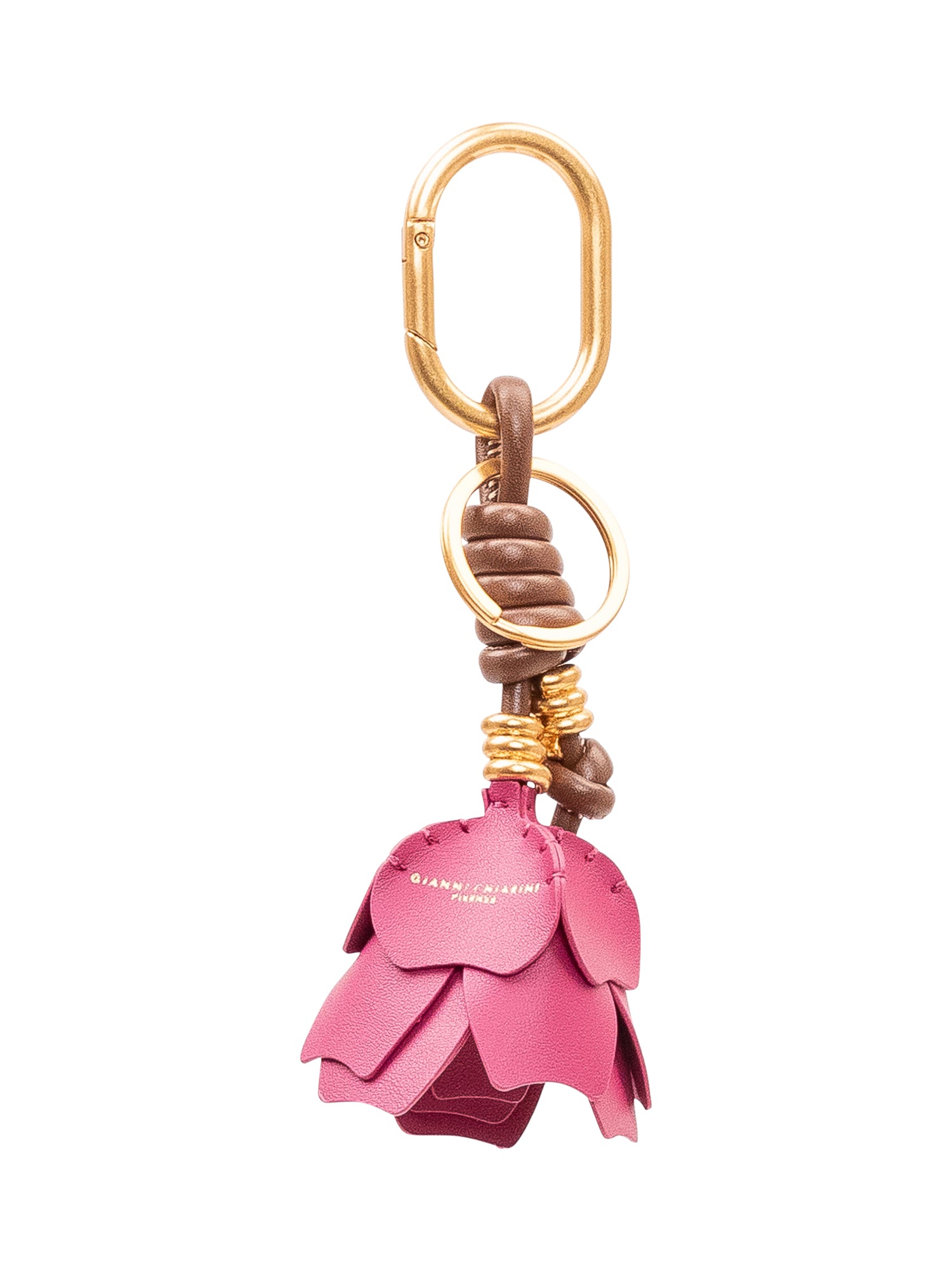 Charm con moschettone e anello, design a forma di fiore con petali sovrapposti e dettagli intrecciati, ideale per personalizzare borse e accessori