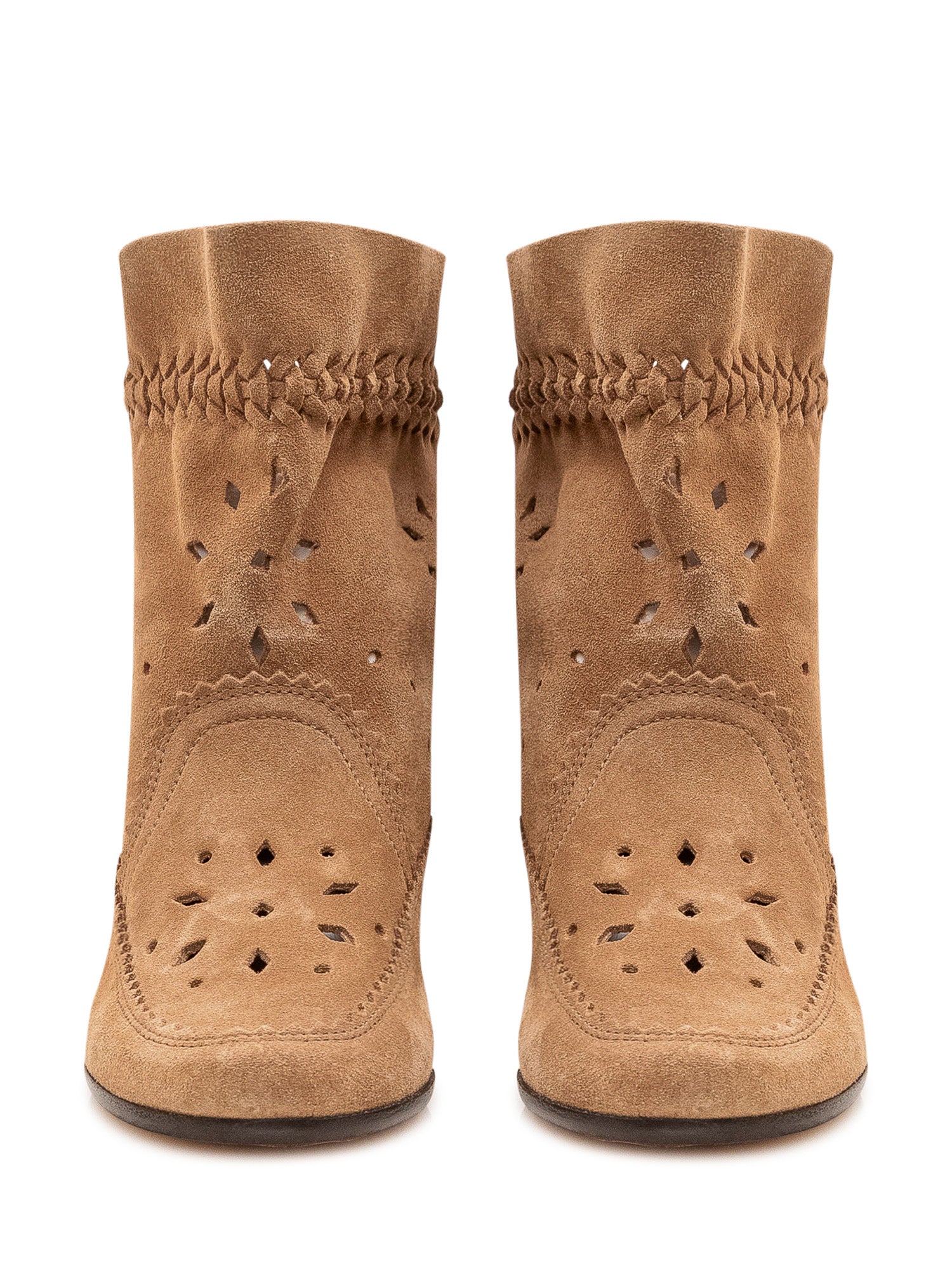 Stivaletto alla caviglia con lavorazione traforata, dettaglio intrecciato e nappine laterali, suola piatta e design morbido
