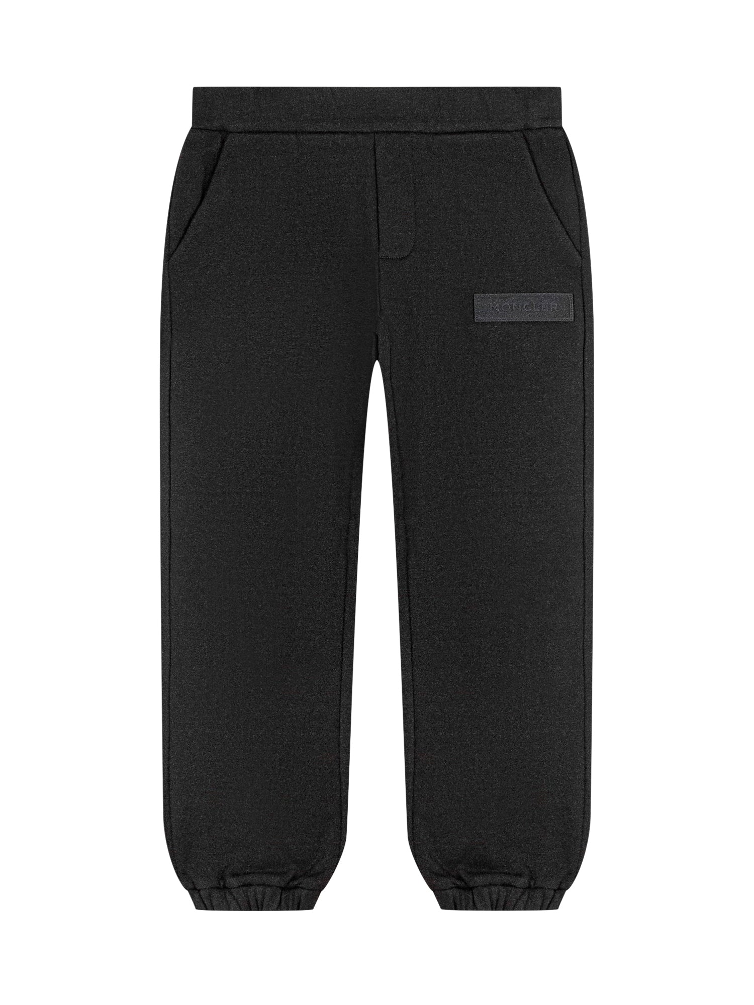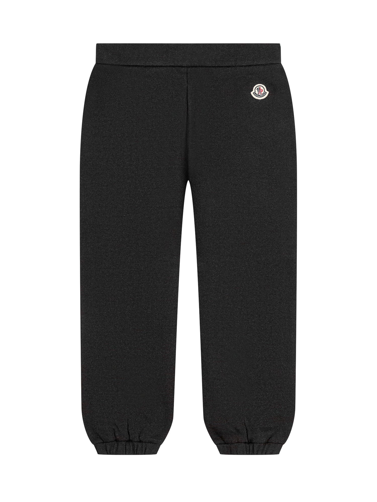 Pantaloni in felpa neri con vita elasticata e polsini alla caviglia. Dettaglio logo Moncler ricamato sul fianco.