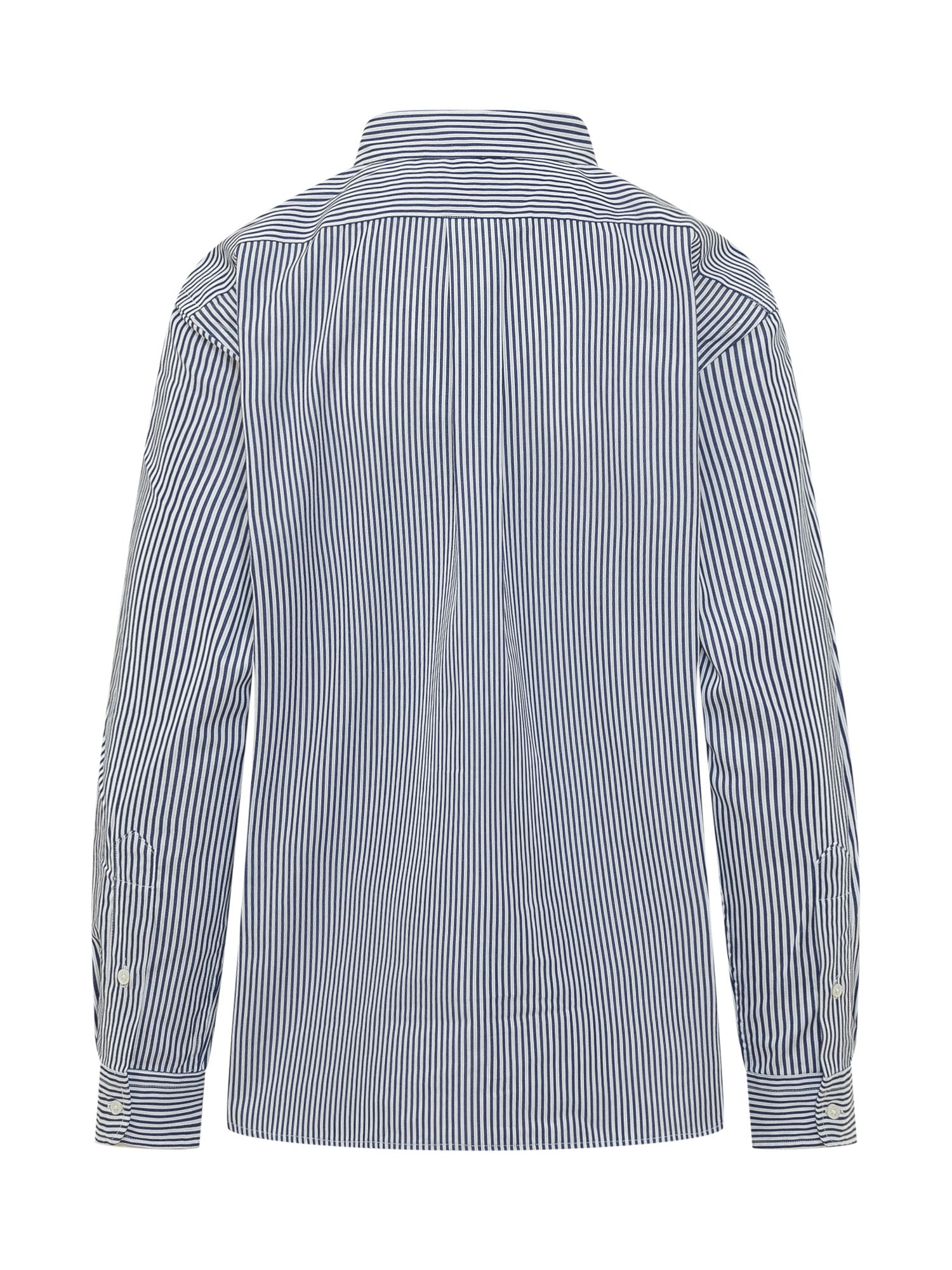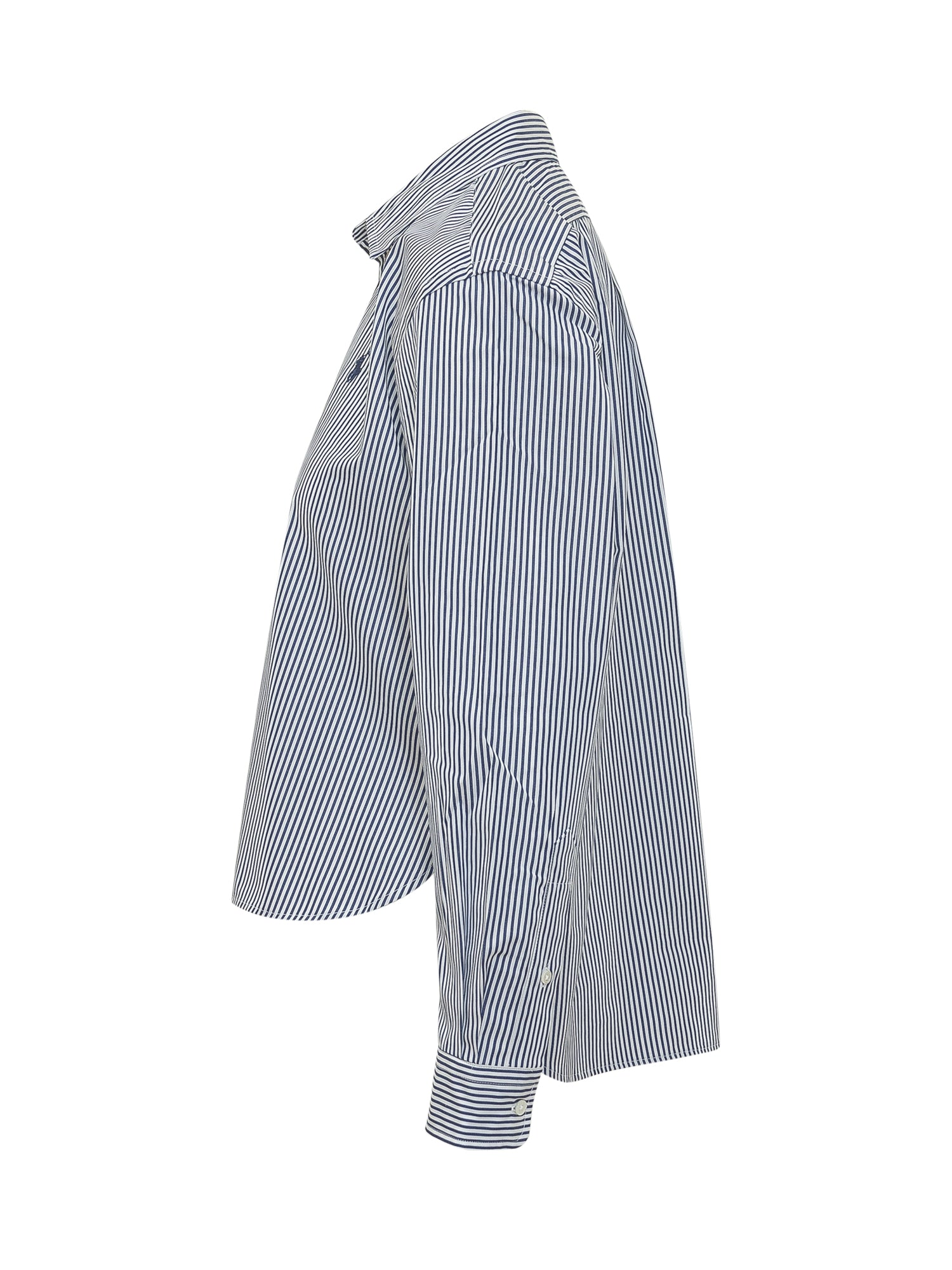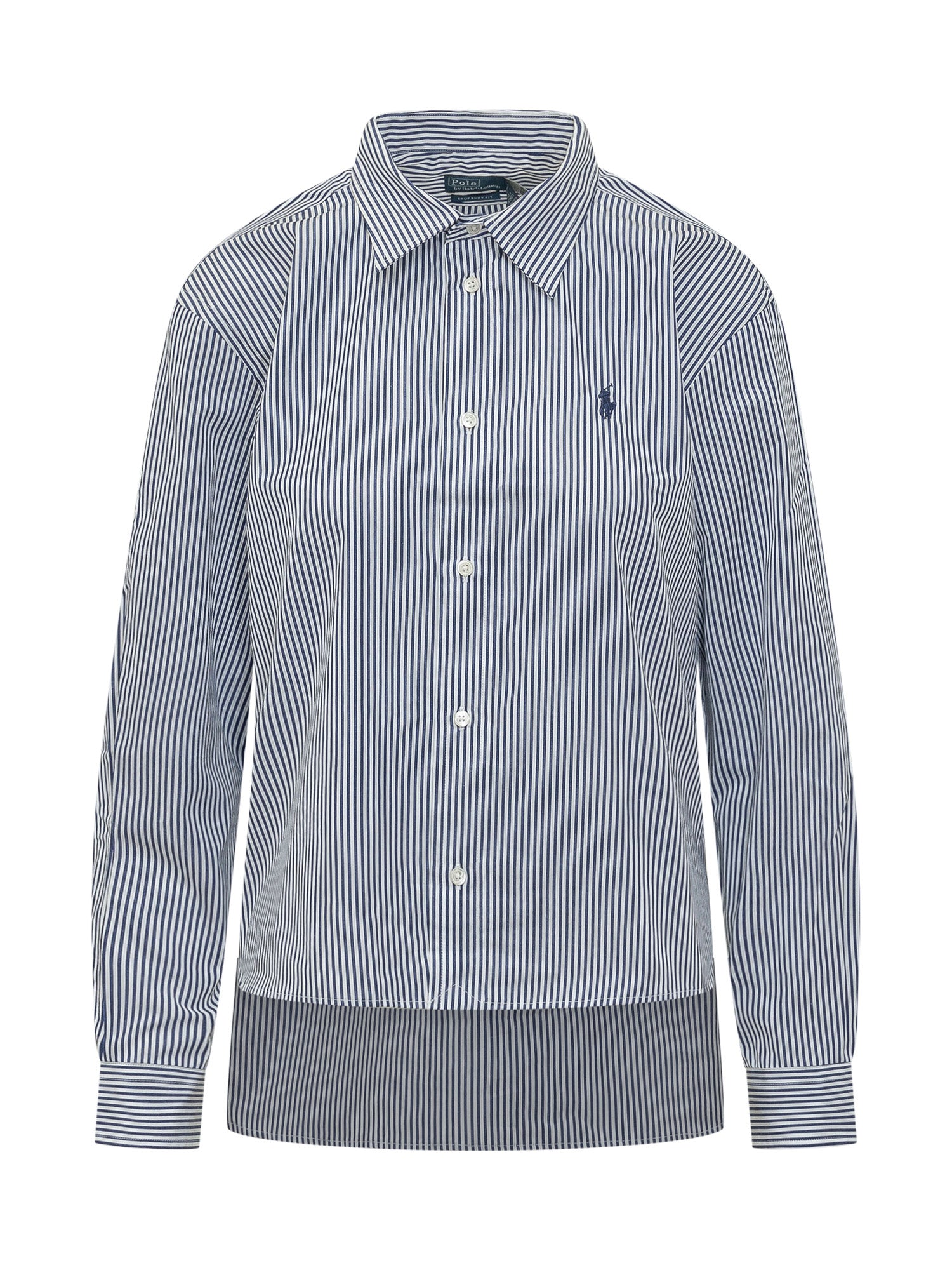 Camicia da donna corta a righe, colletto classico, chiusura frontale con bottoni, maniche lunghe con polsini.