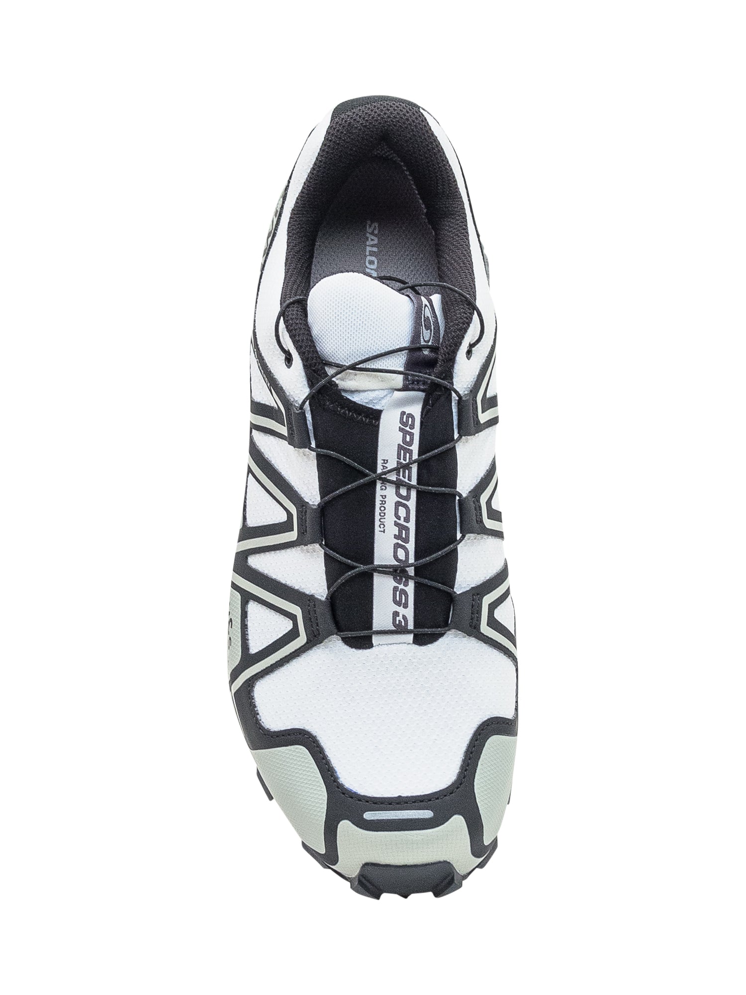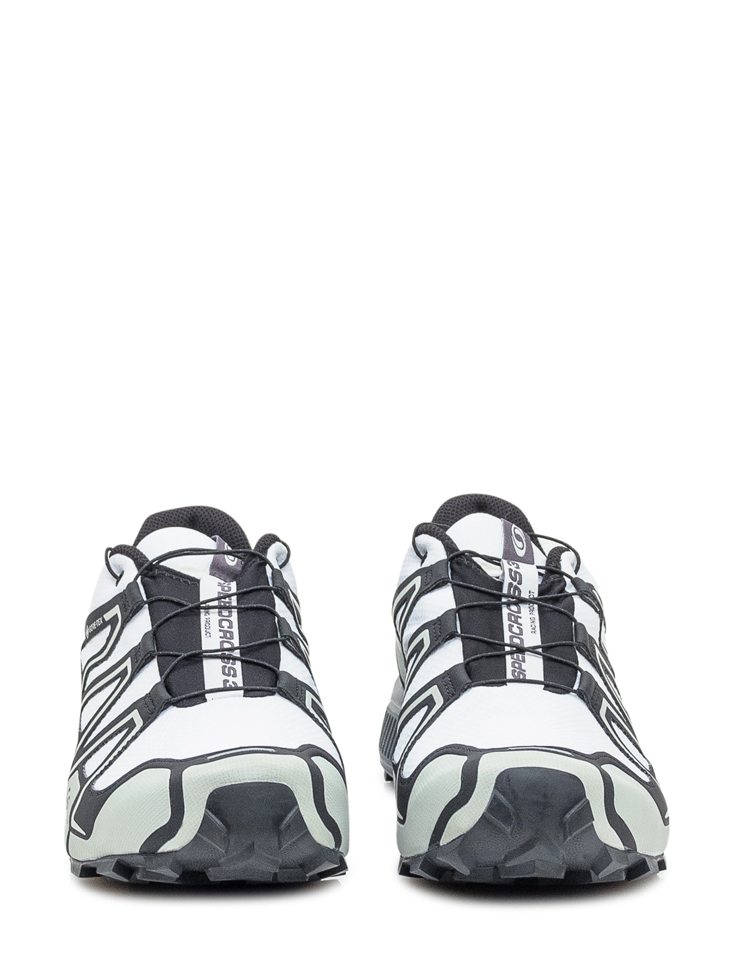 Sneakers Salomon Speedcross 3 GTX in mesh tecnico bianco con dettagli neri e grigio salvia. Dotate di membrana Gore-Tex impermeabile e suola Contagrip, offrono trazione e comfort ideali per il trail running e l uso urbano.