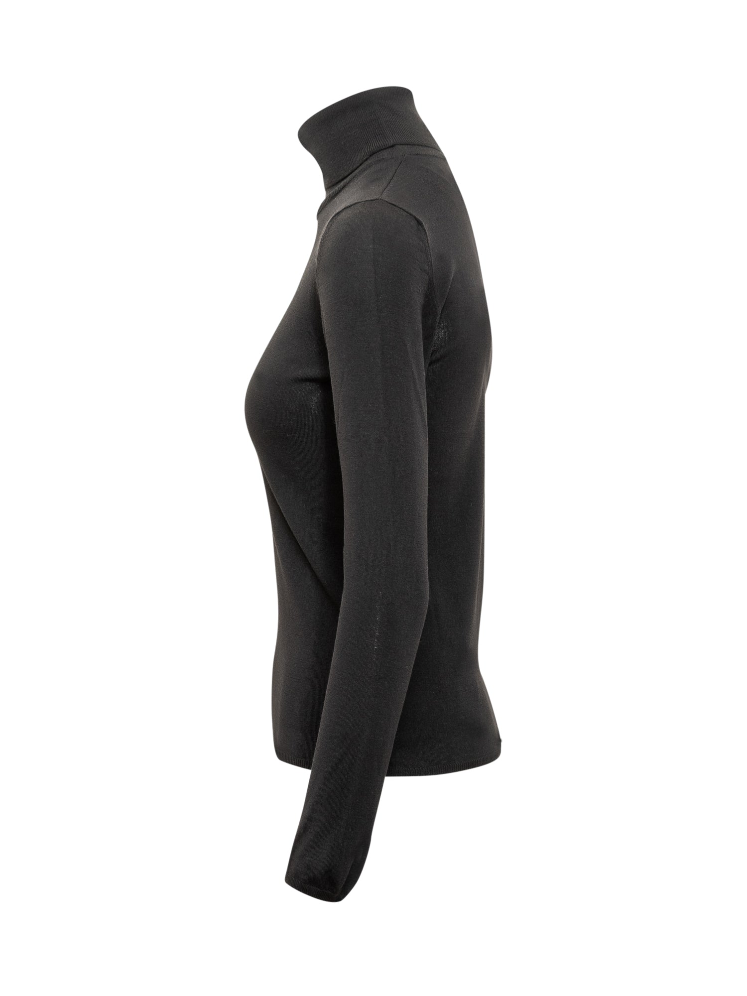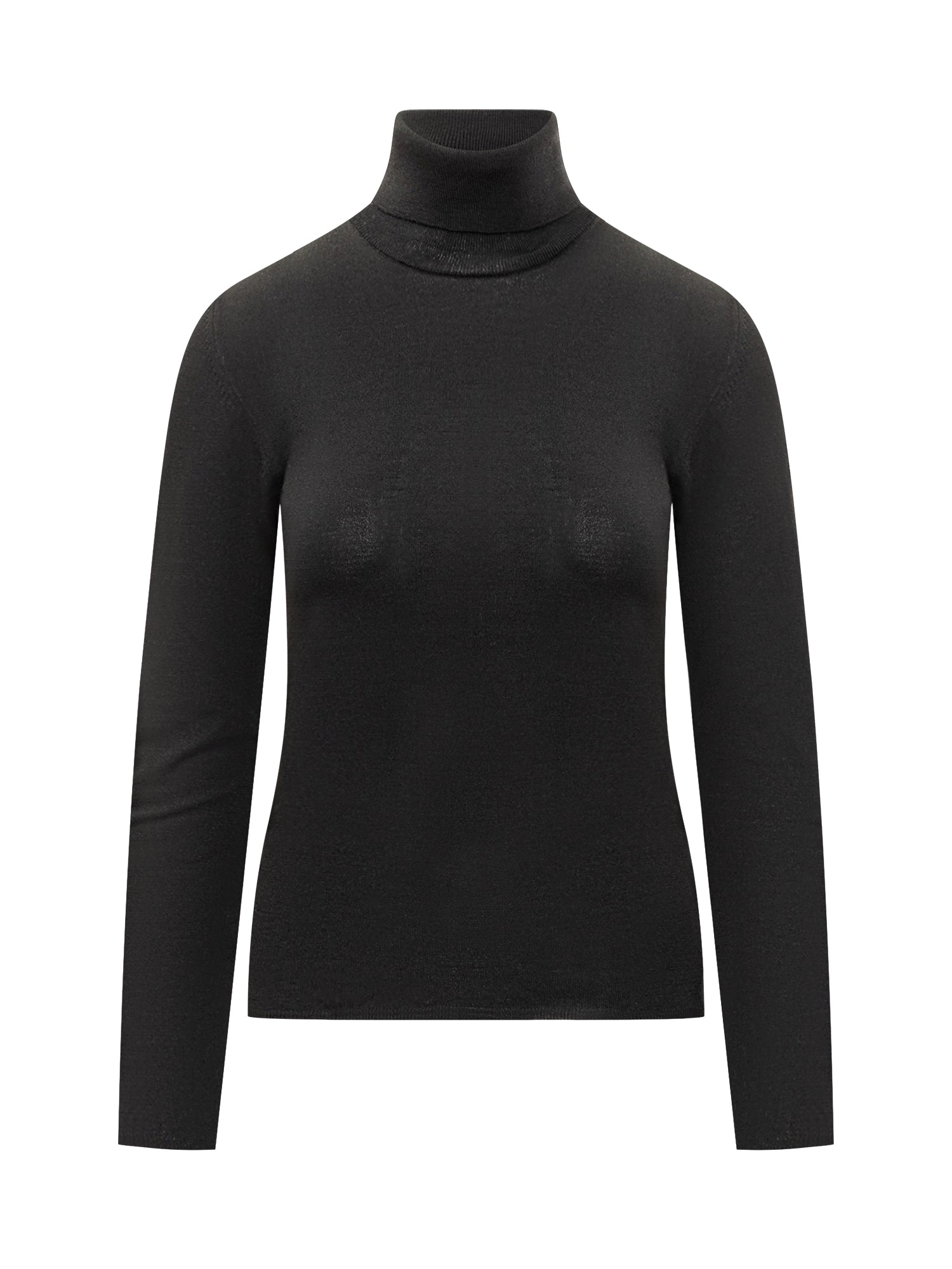 Dolcevita nero a maniche lunghe in lana sottile, dal taglio aderente e design minimal, ideale per look eleganti e stratificazioni raffinate.