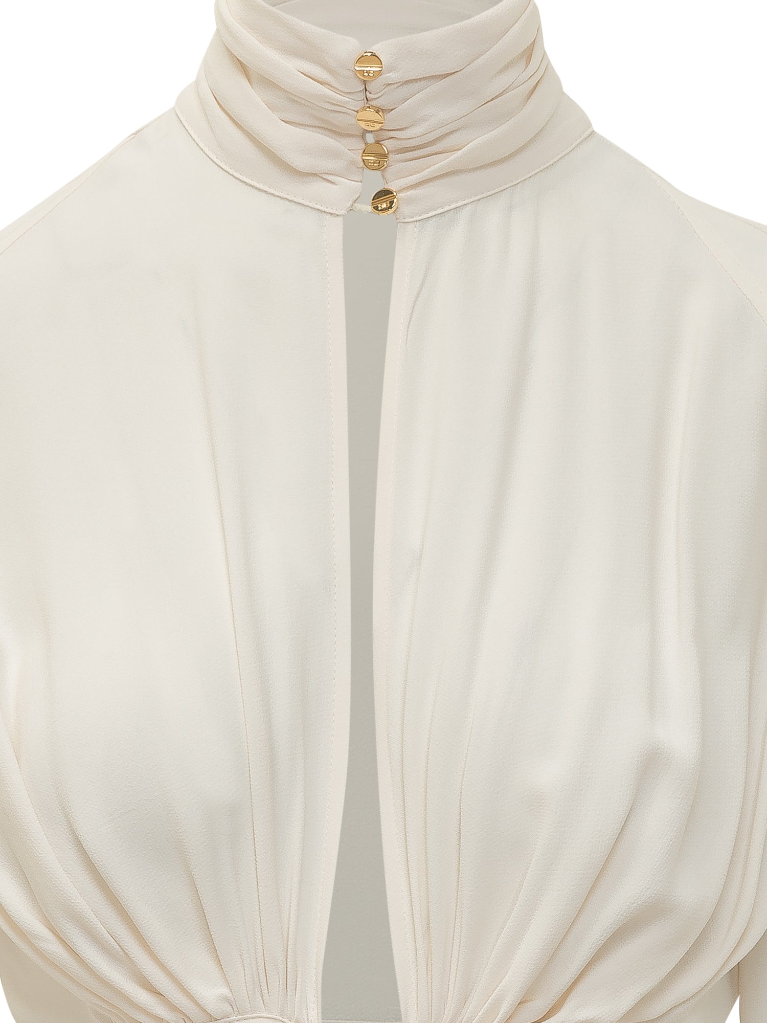 Blusa con collo alto arricciato e bottoni decorativi sul davanti. Maniche ampie con spacchi e cintura da annodare in vita. Linea fluida e ricercata.