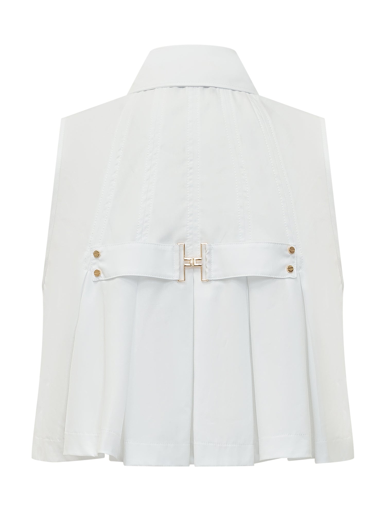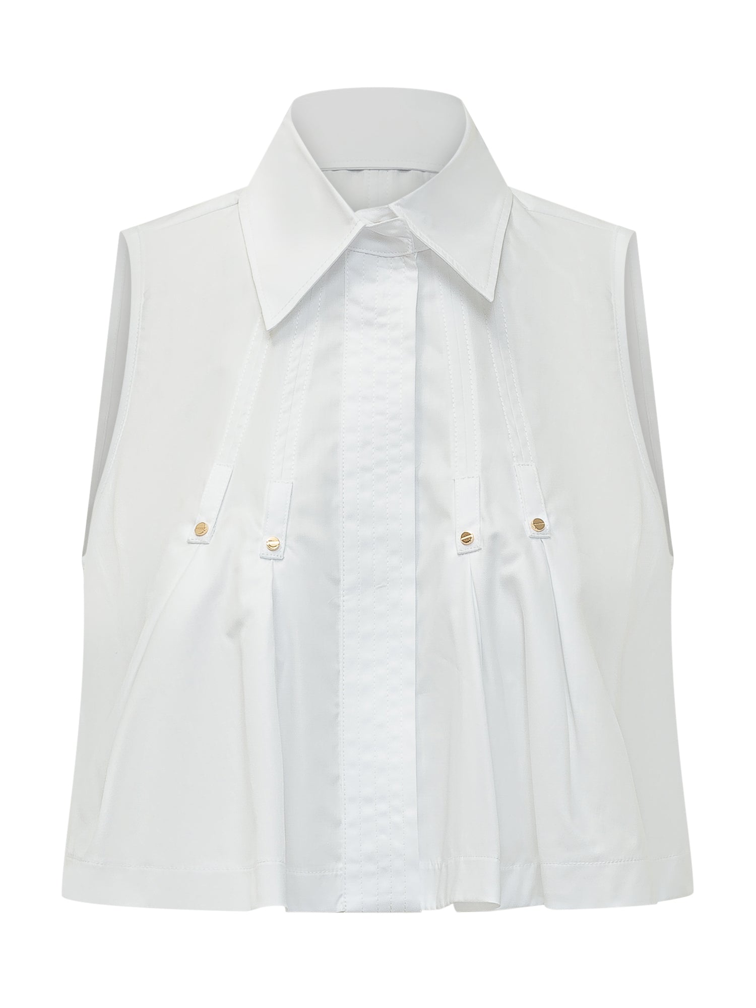 Camicia senza maniche con colletto classico e chiusura frontale nascosta. Pannelli frontali con cuciture verticali e bottoni decorativi. Linea ampia e strutturata.