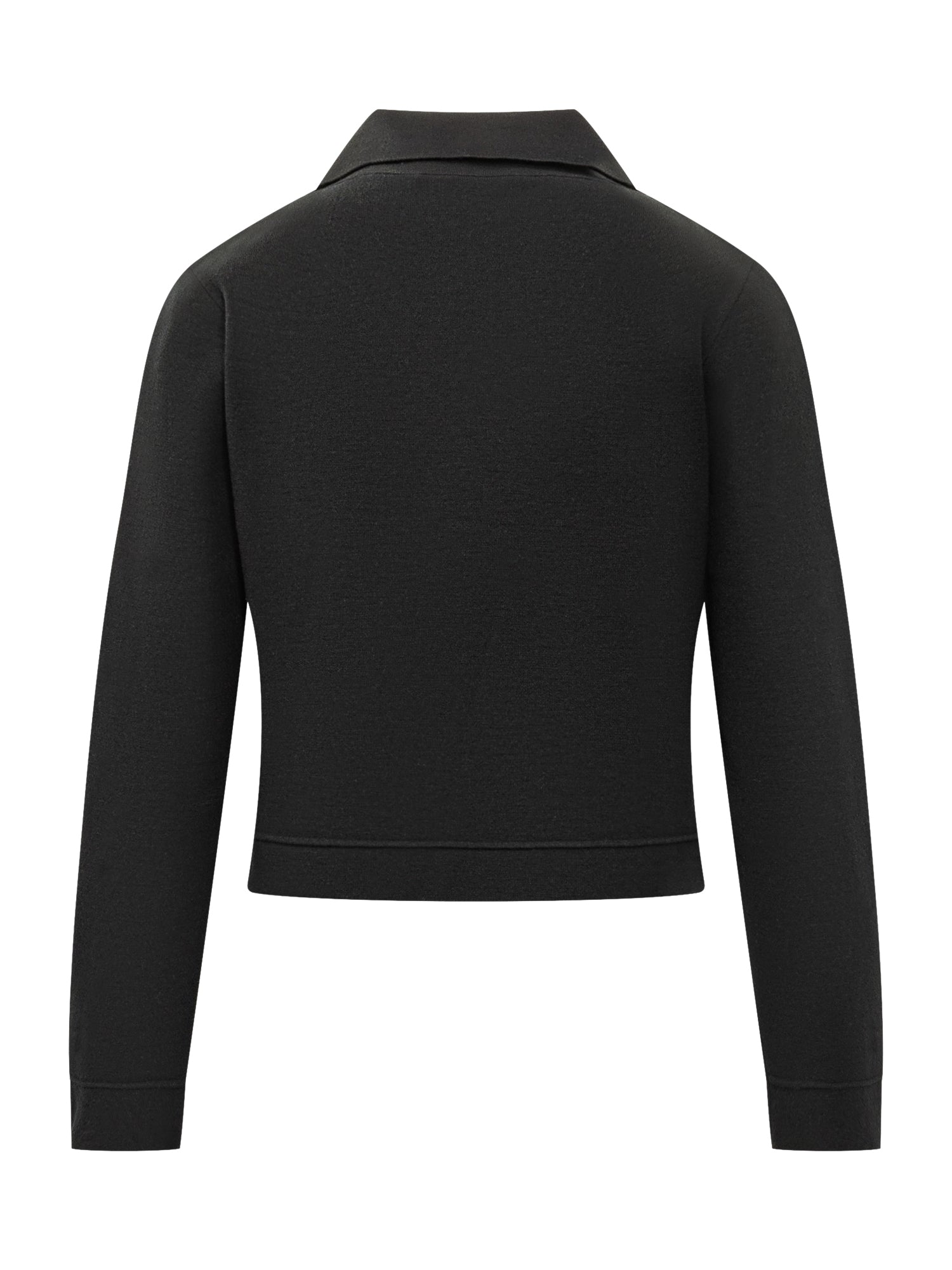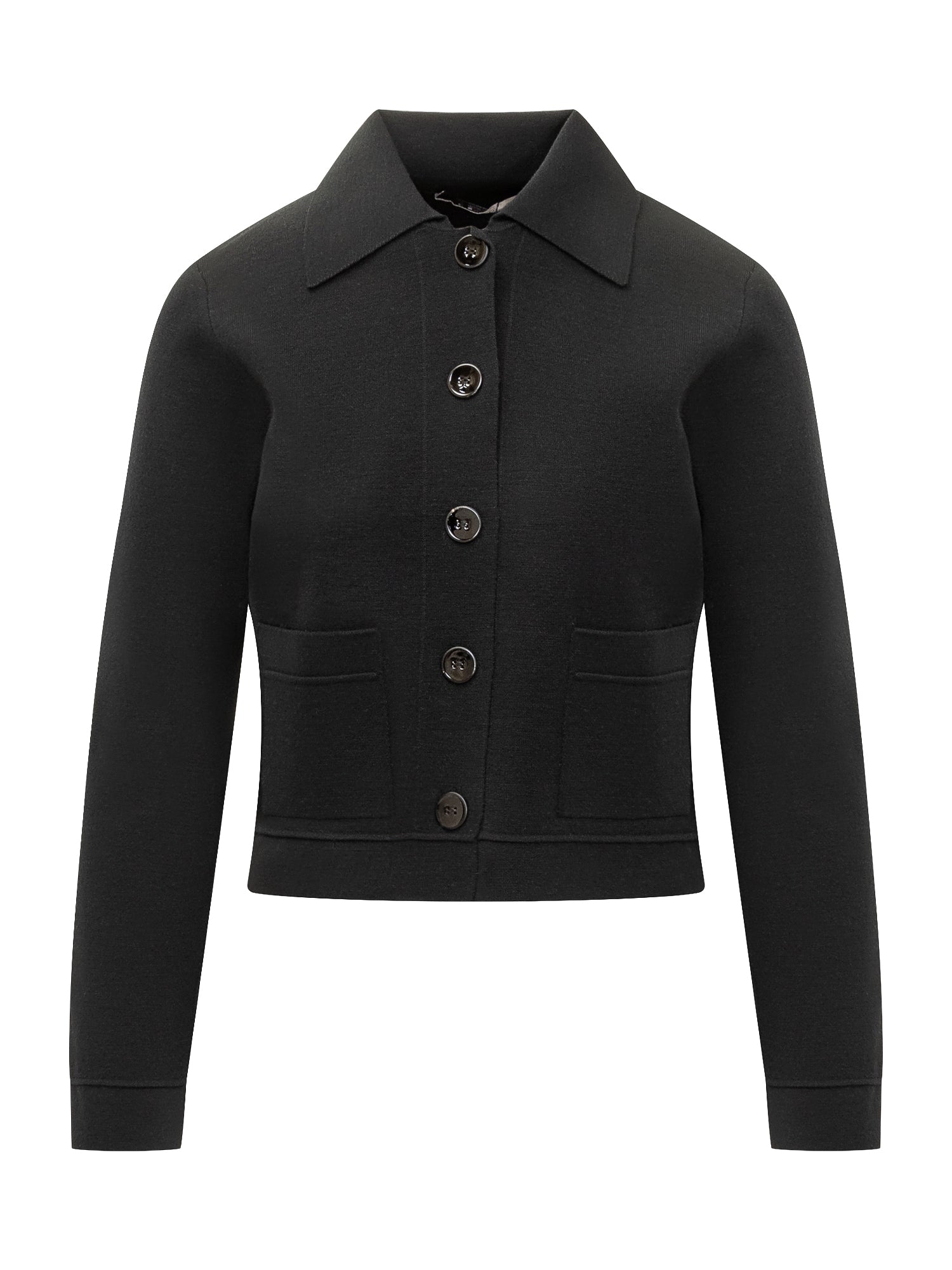 Giacca Exterior in maglia nera con chiusura a cinque bottoni e tasche frontali.