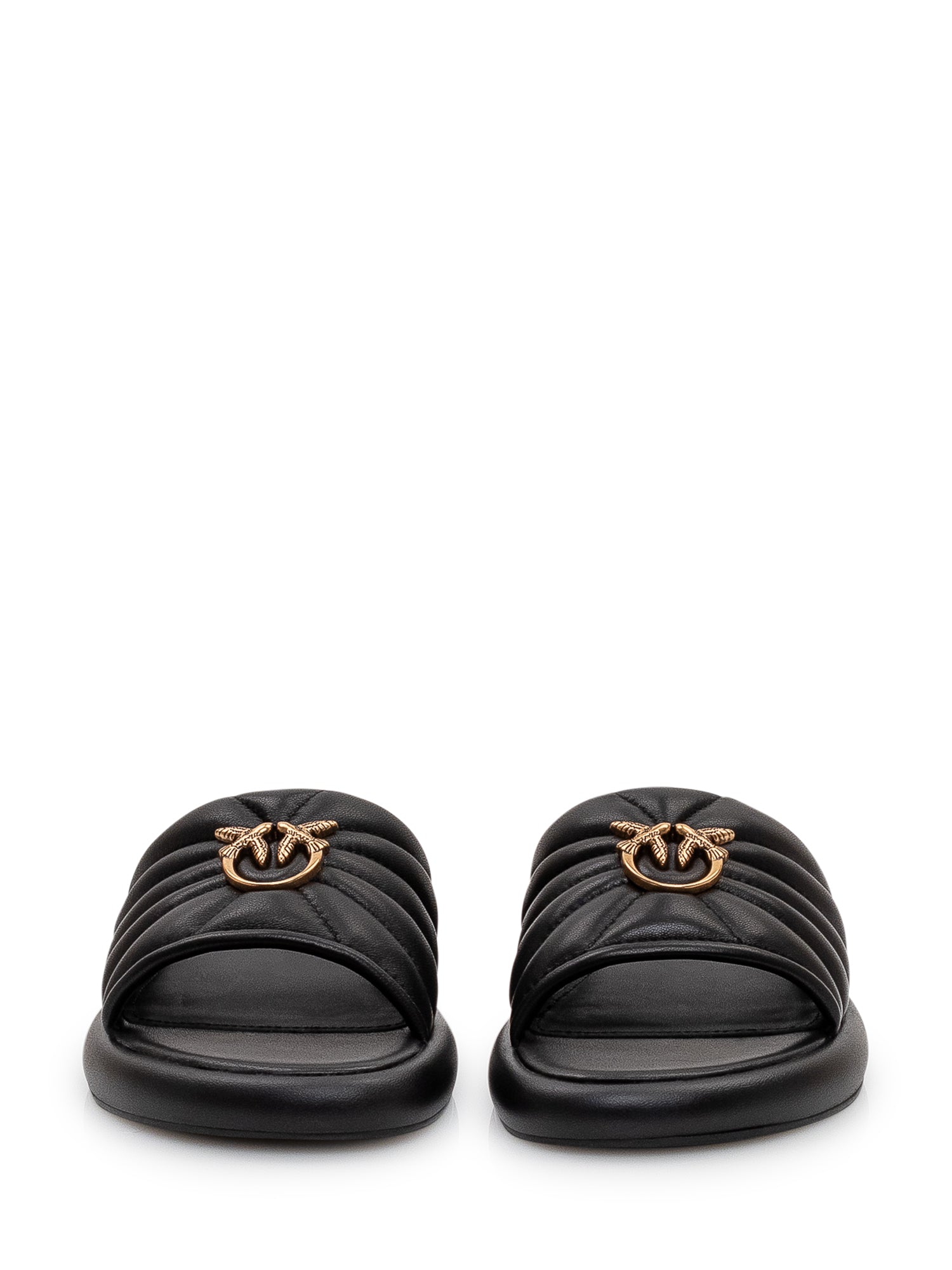Ciabatta flat in pelle con fascia imbottita dal design trapuntato e punta aperta. Modello arricchito da applicazione logo in metallo sulla tomaia e suola sagomata per un comfort ottimale, perfetto per un look moderno e disinvolto.