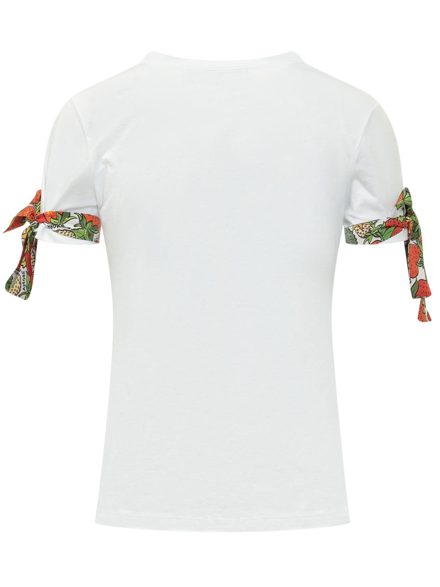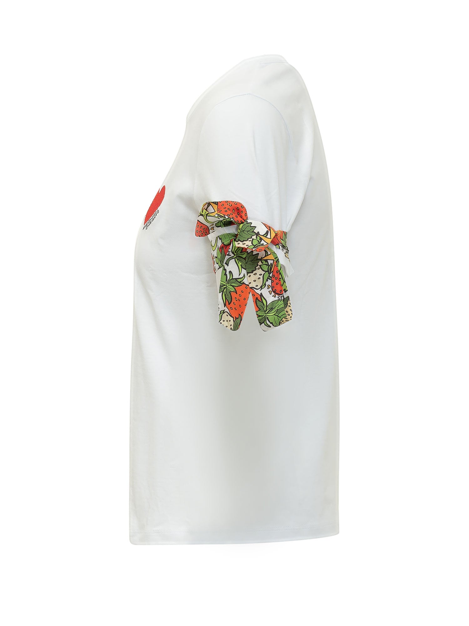 T-shirt da donna bianca a maniche corte con vestibilità slim e girocollo classico. Presenta un piccolo ricamo a cuore sul petto e originali nastri decorativi con stampa fragole sulle maniche, che aggiungono un tocco fresco e giocoso perfetto per look casual estivi.