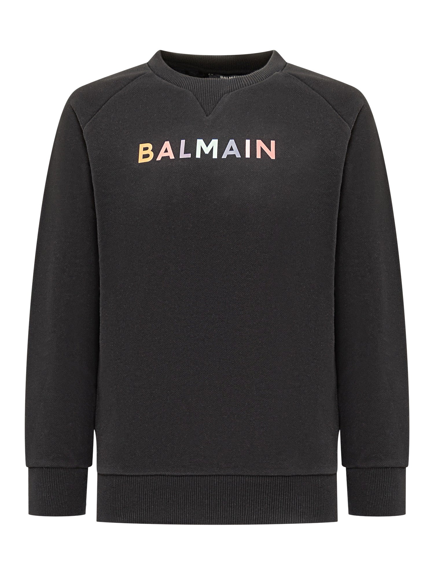 Felpa nera Balmain Kids in cotone, caratterizzata dal logo multicolor stampato sul petto.