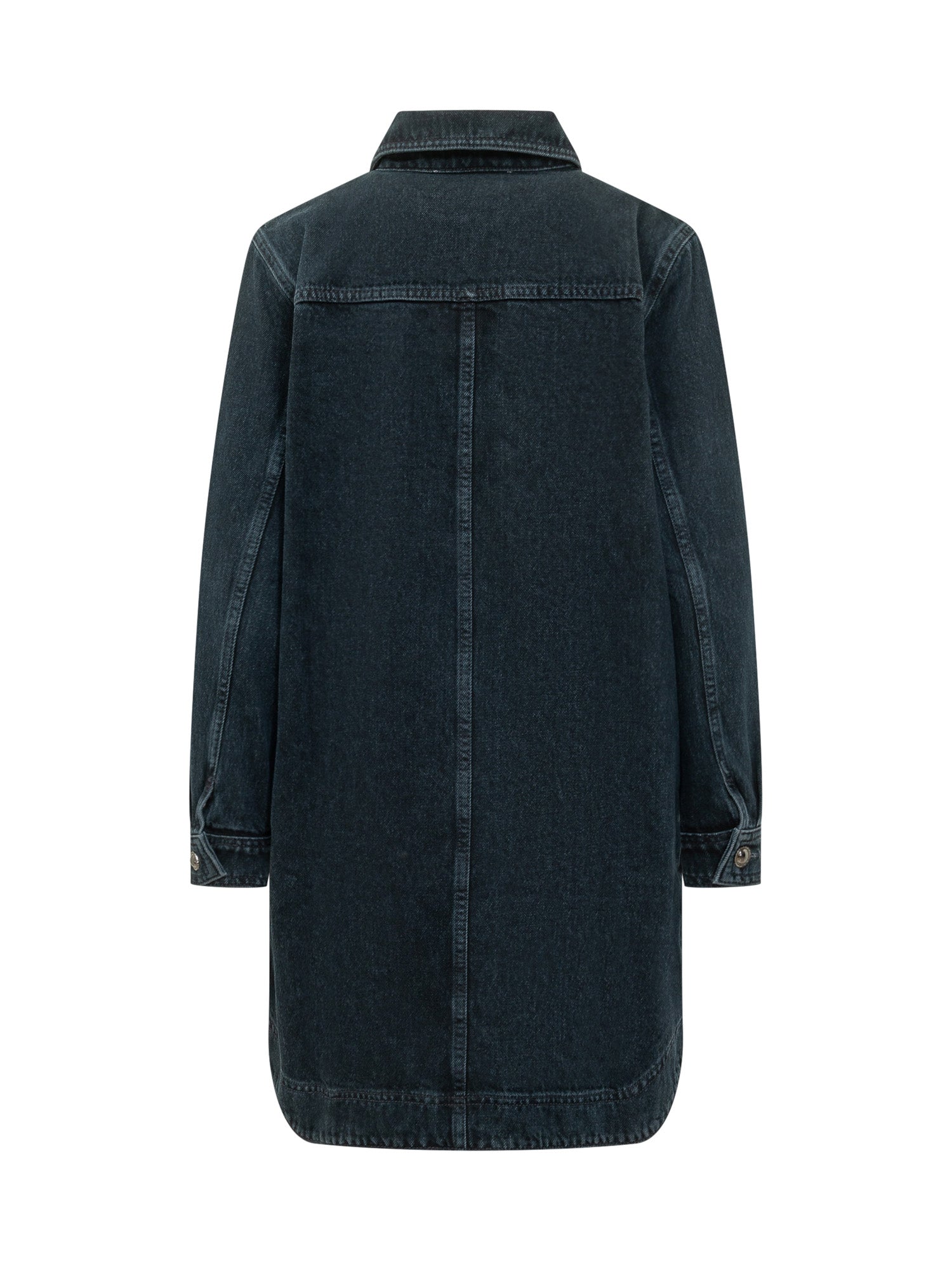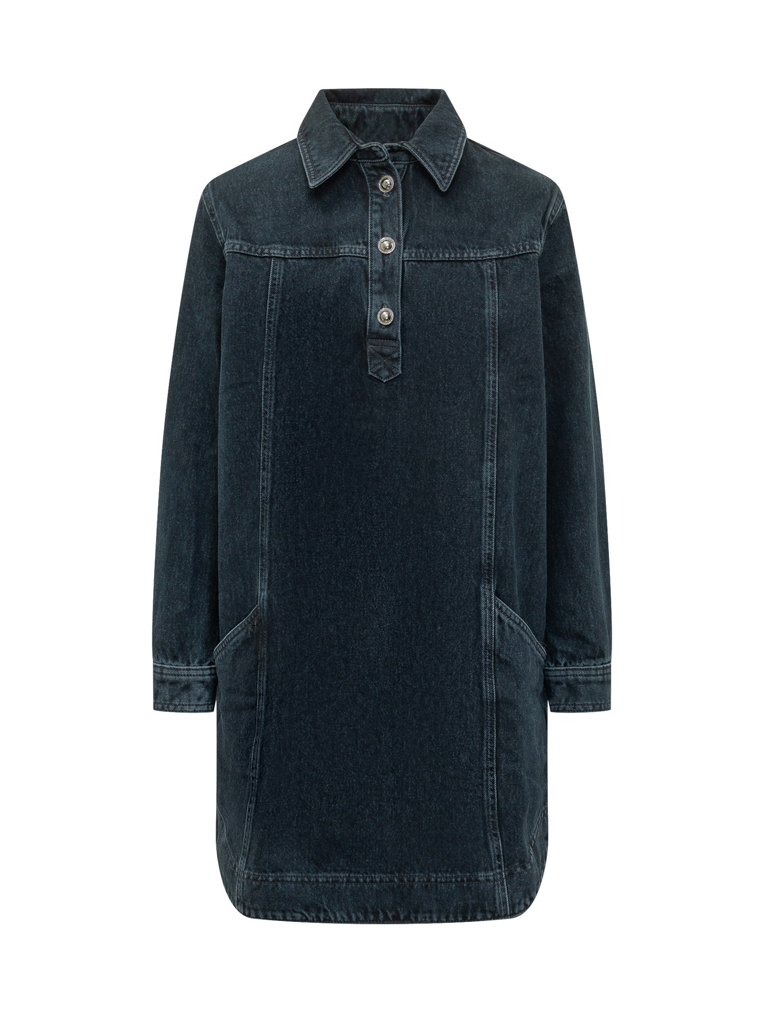 Abito corto in denim con colletto classico e chiusura con bottoni. Maniche lunghe e tasche laterali.
