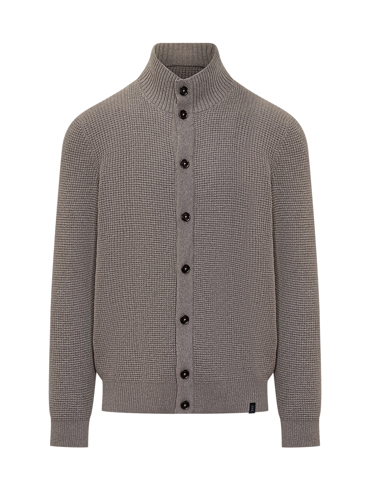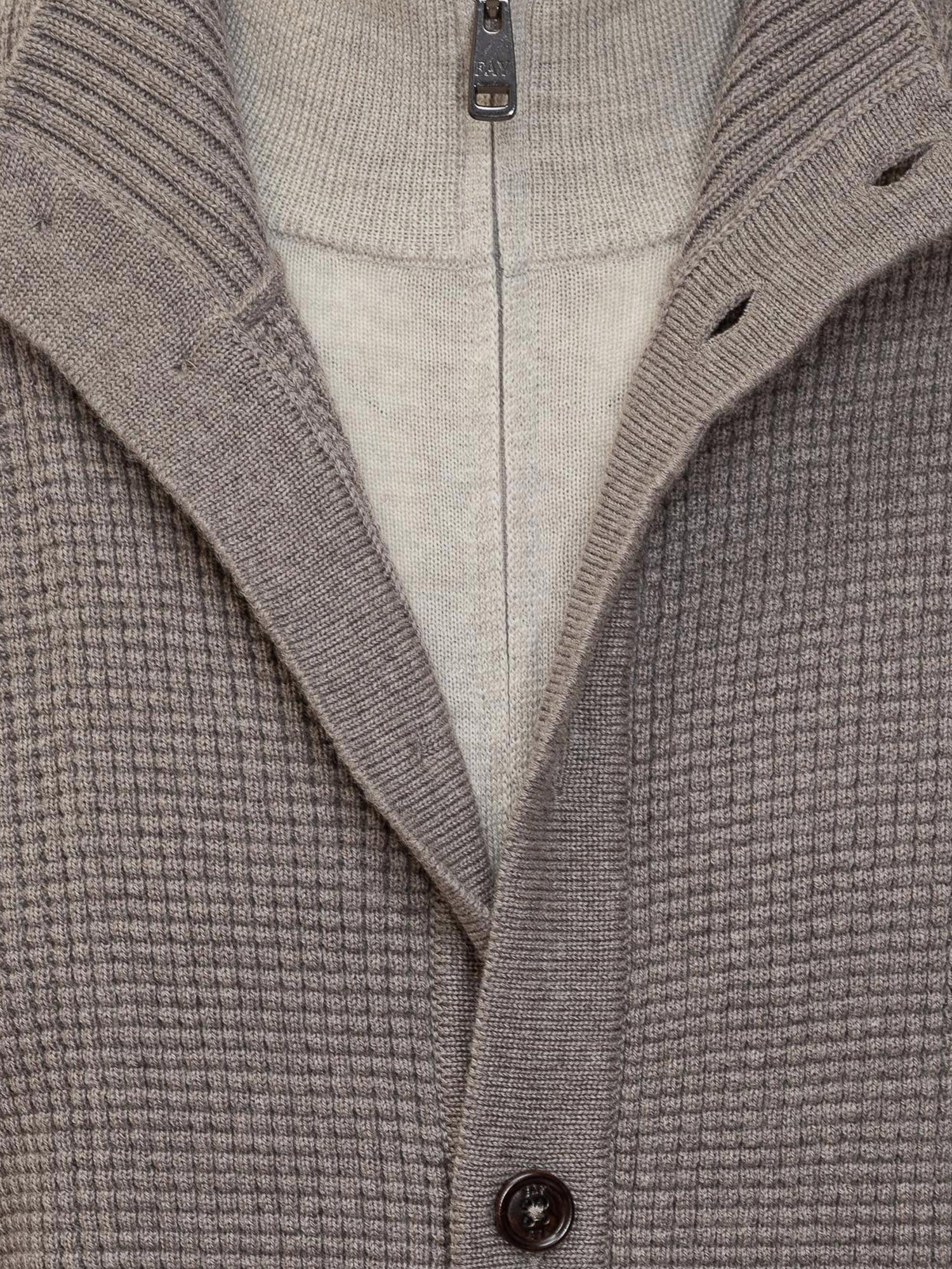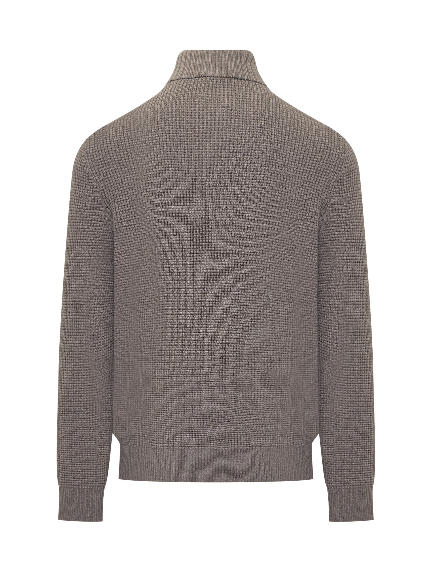 Maglione collo alto. Doppia chiusura con zip e bottoni. Orli a costine.