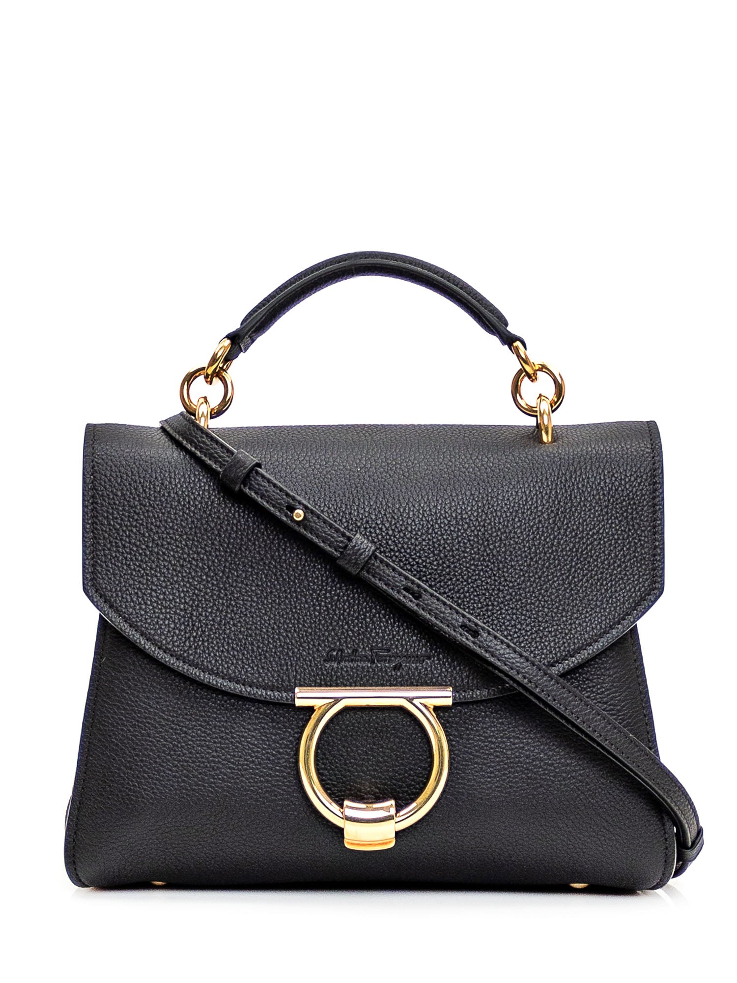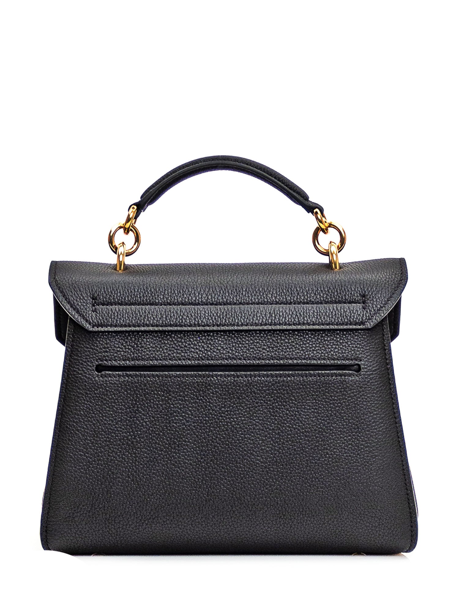 Borsa a mano nera in pelle martellata. Un manico. Tracolla regolabile e rimovibile. Due scomparti interni. Chiusura con patta con Gancino in metallo dorato. Logo sul davanti.
