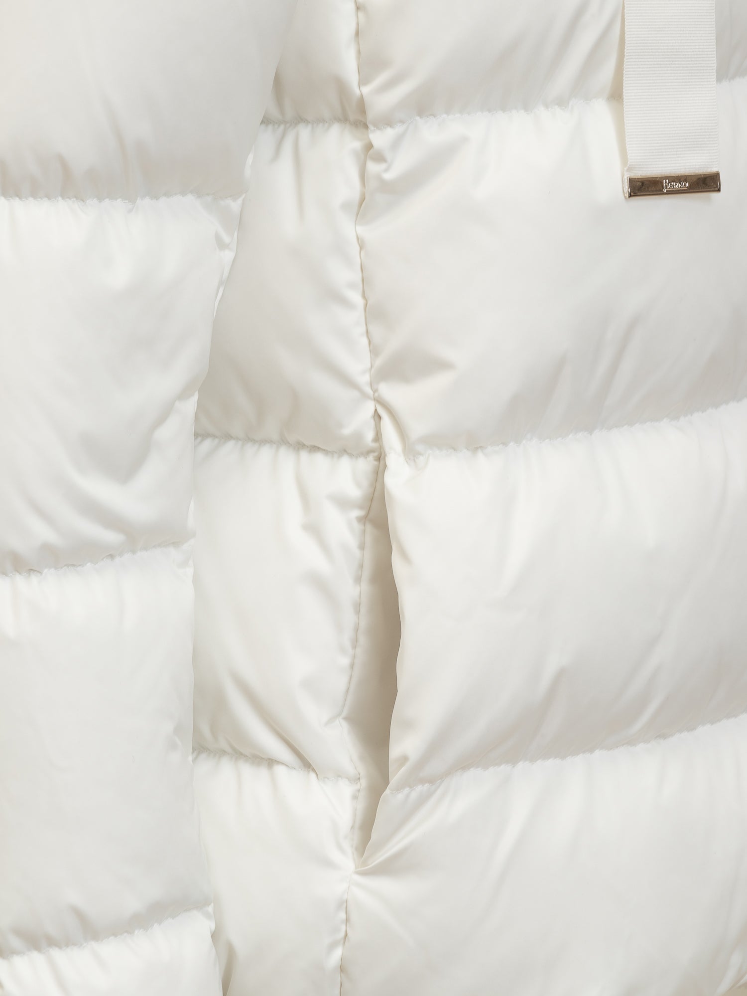 Piumino bianco a collo alto. Coulisse. Tasche laterali. Targhetta logo sul retro. Chiusura con bottoni. Effetto raso.