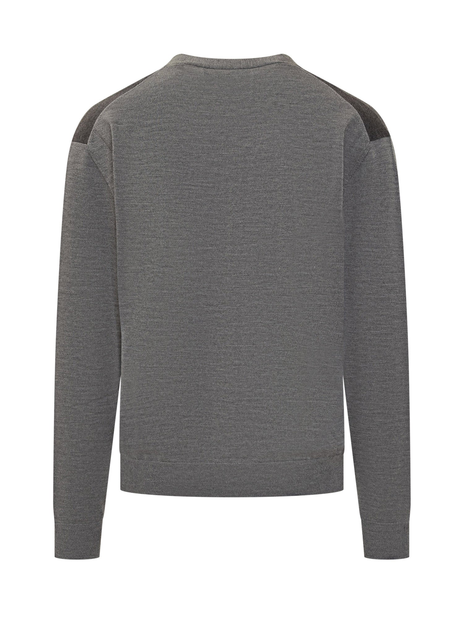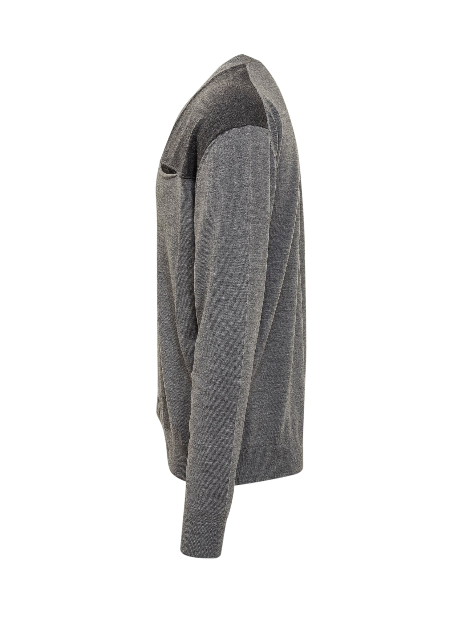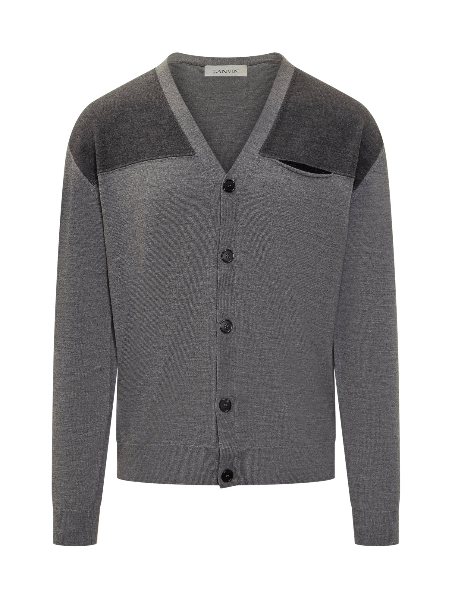 Cardigan Lanvin in lana grigia con chiusura a bottoni, scollo a V e dettagli a contrasto su spalle e taschino.