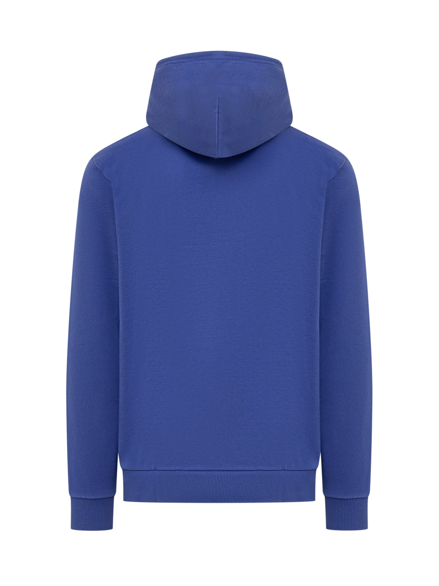 Felpa blu in cotone. Cappuccio con coulisse. Maxi tasca sul davanti. Polsi e orlo a costine. Logo ricamato.