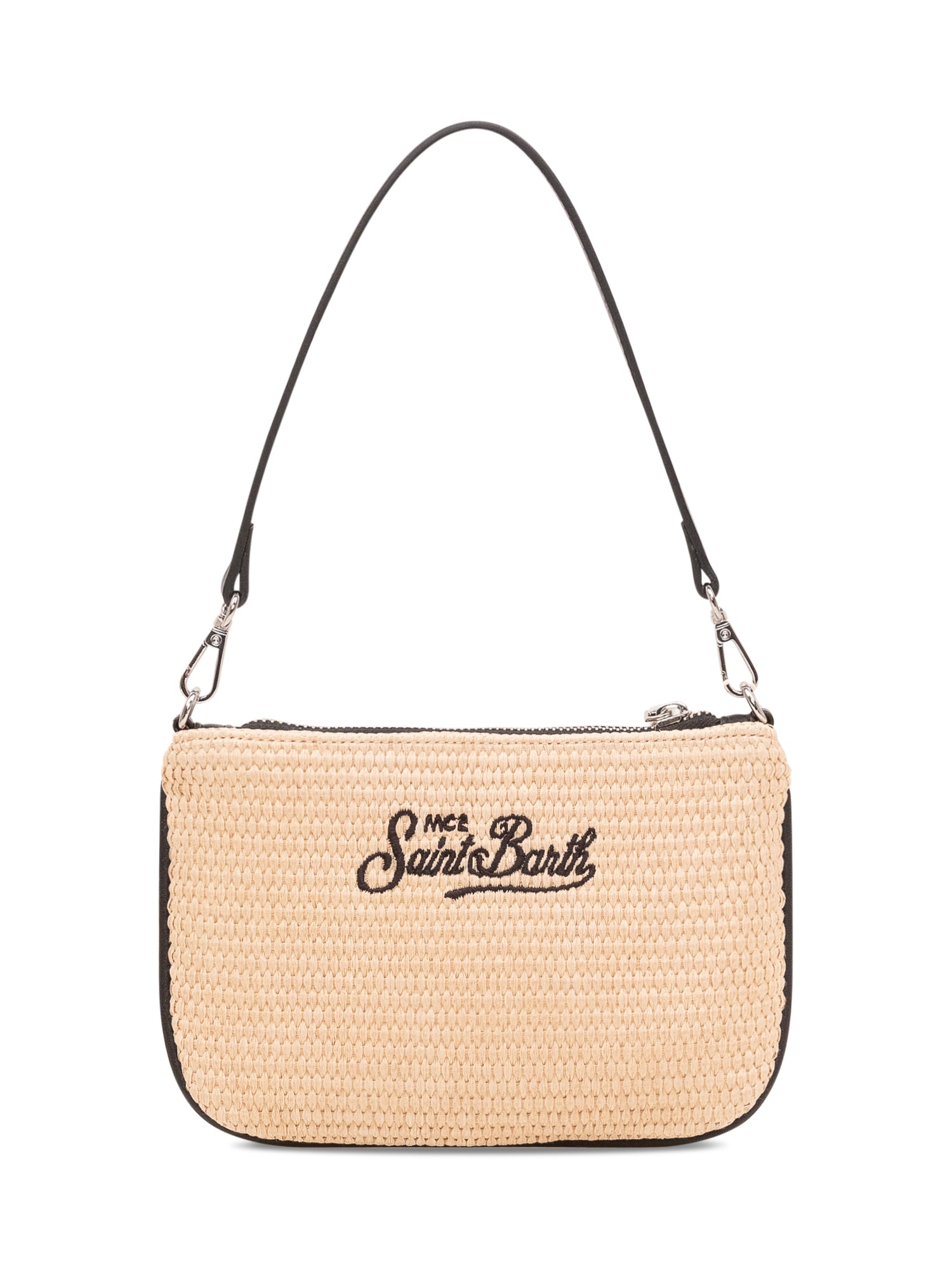 Borsa a spalla in paglia con chiusura zip, tracolla sottile e logo ricamato frontale, formato compatto e struttura morbida