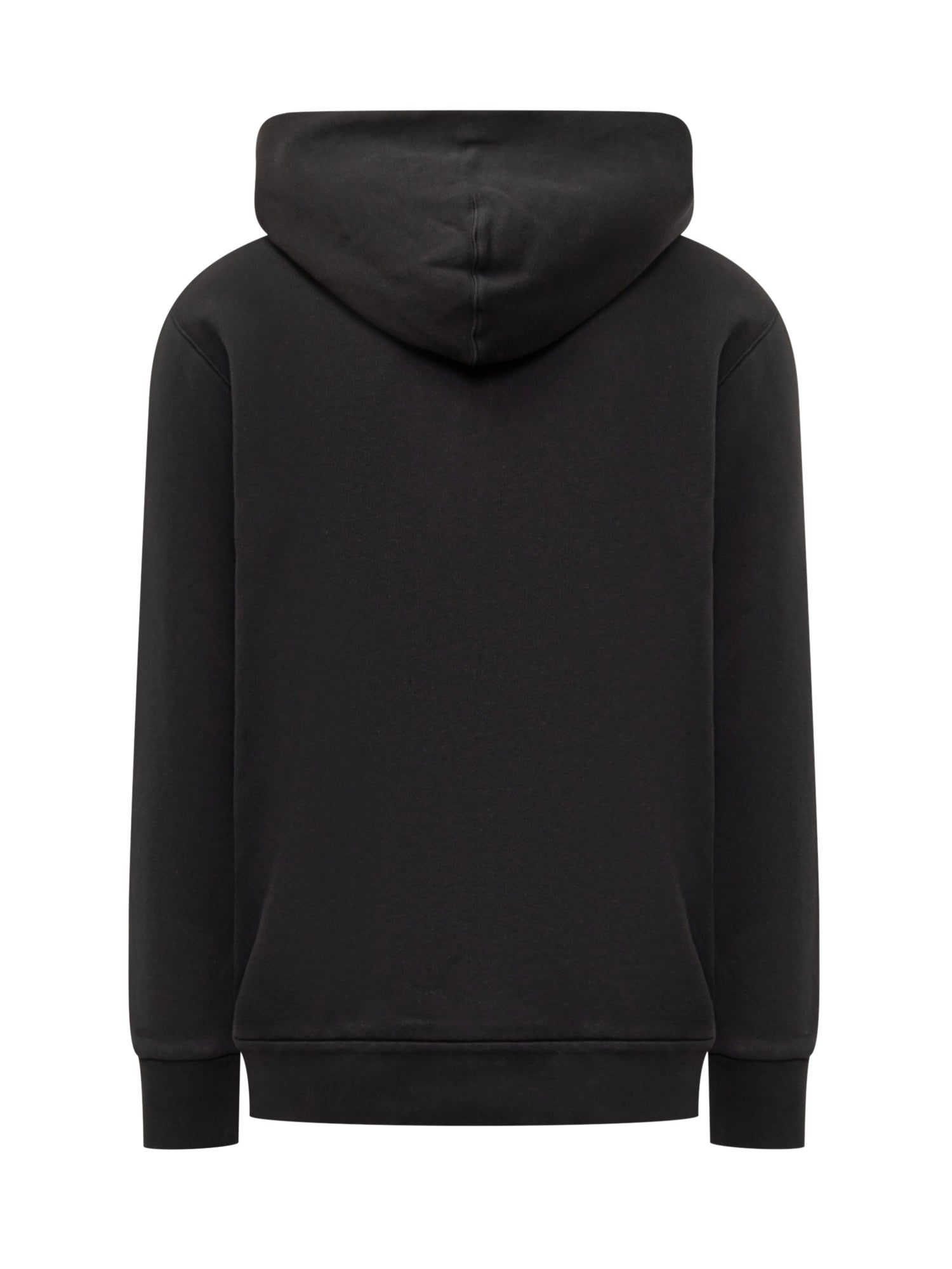 Felpa nera con cappuccio. Due tasche frontali. Stampa frontale. Logo applicato. Chiusura con zip.