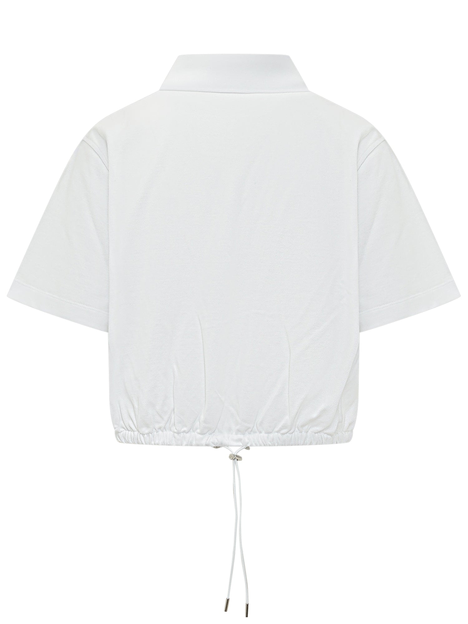 Polo a maniche corte in cotone con colletto classico e chiusura a due bottoni. Caratterizzata da fondo regolabile con coulisse per un effetto arricciato e vestibilità personalizzabile. Logo tono su tono applicato sul petto. Design contemporaneo che unisce stile sportivo e dettagli femminili.