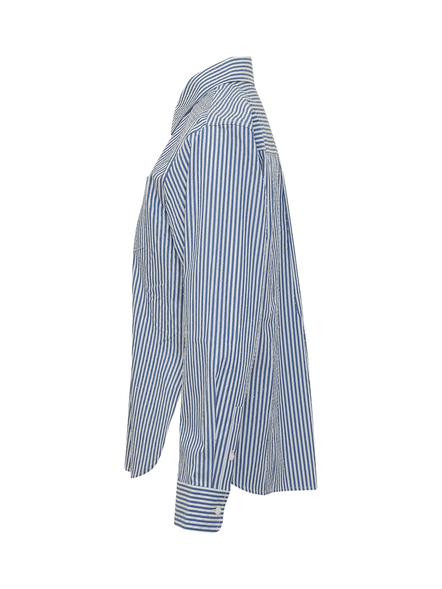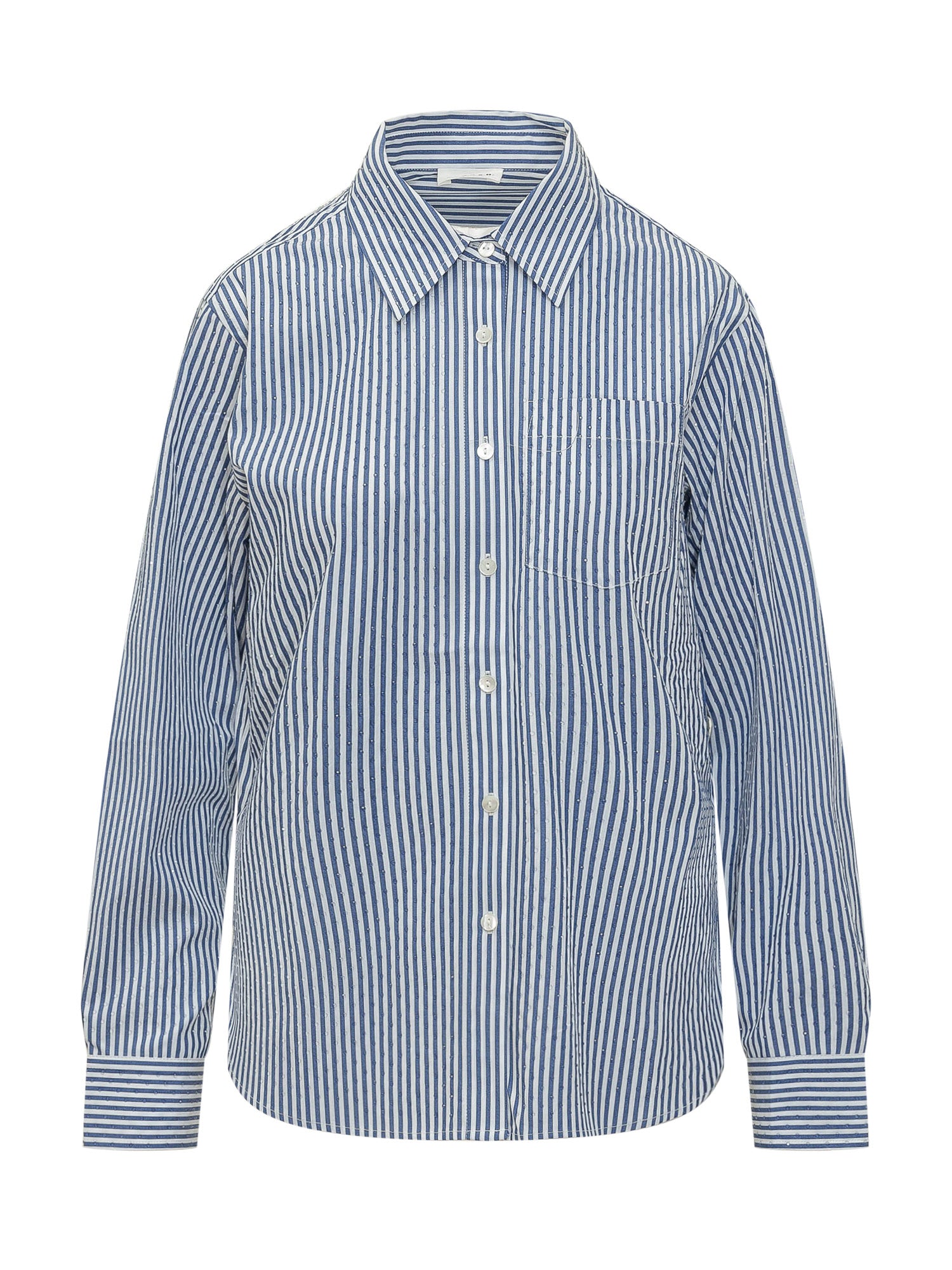 Camicia da donna a righe, colletto classico, chiusura frontale con bottoni, maniche lunghe con polsini, taschino sul petto.
