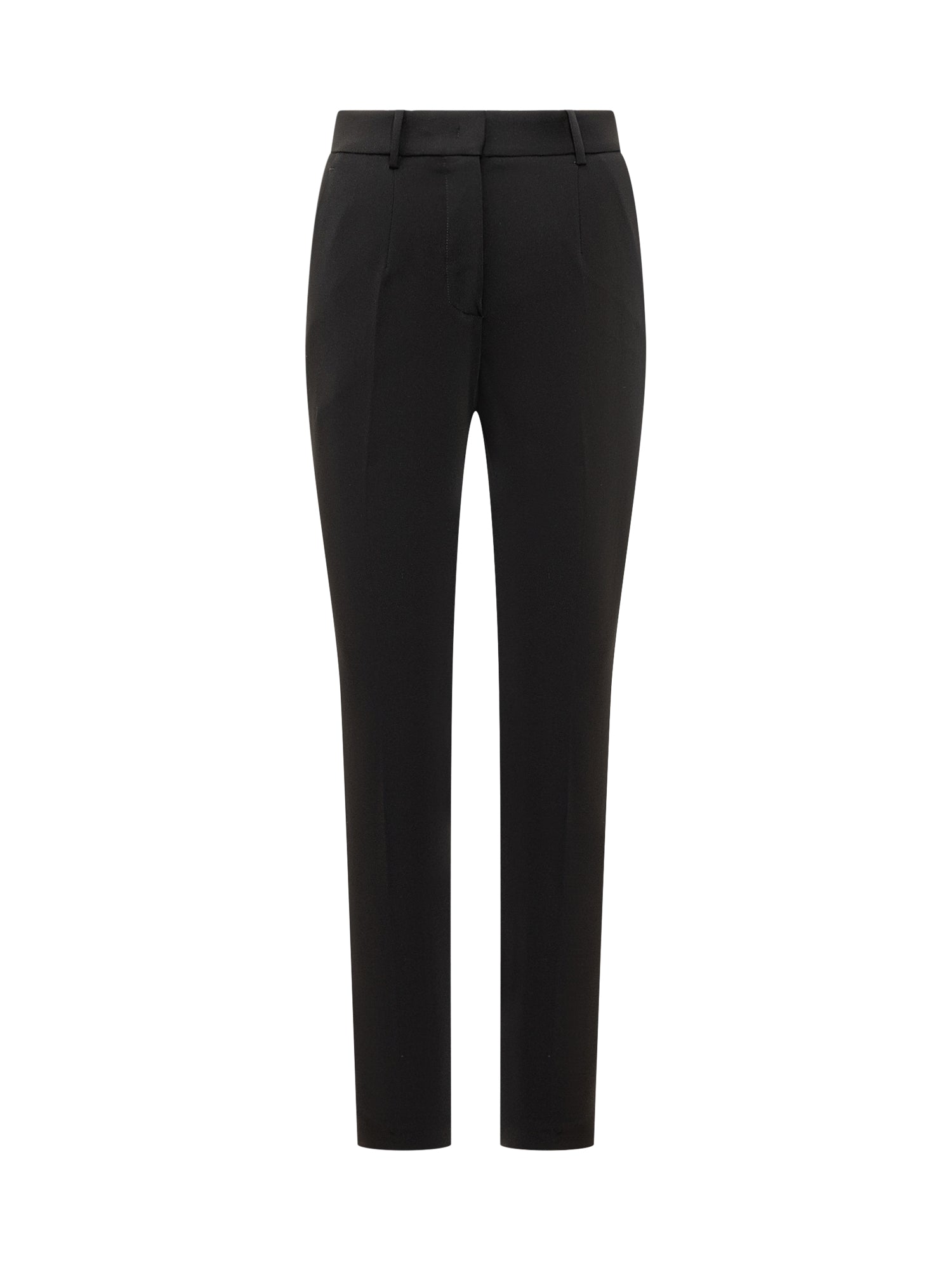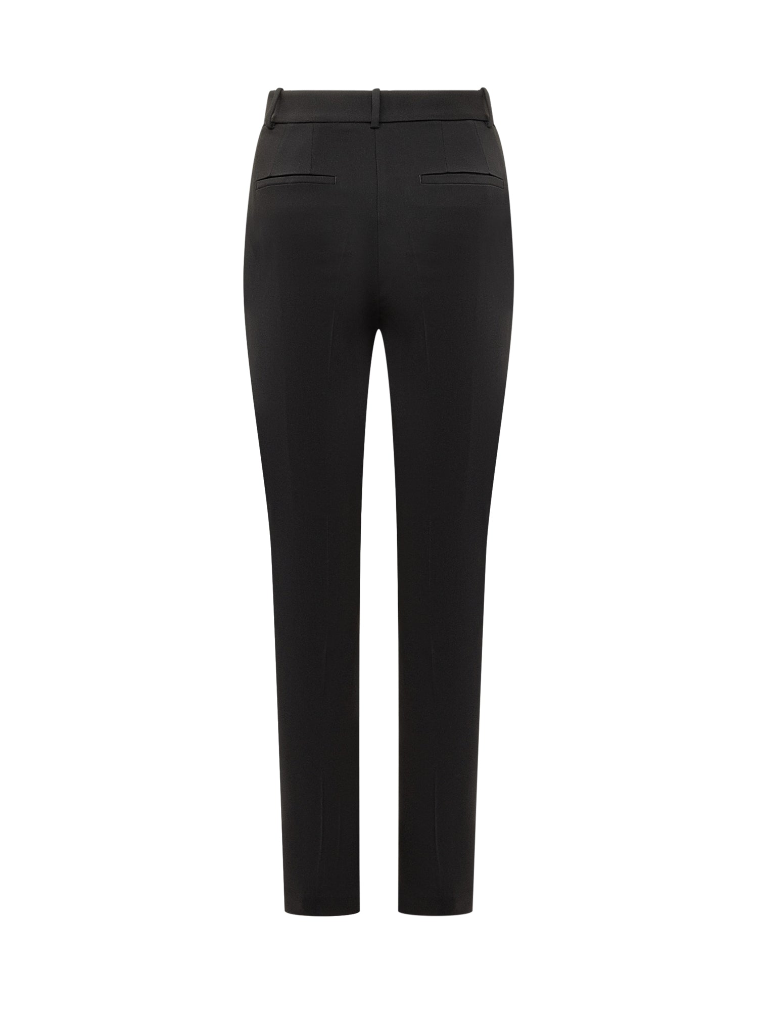 Pantalone nero. Chiusura con gancino, bottone e zip. Passanti per cintura. Tasche a filetto sul retro.