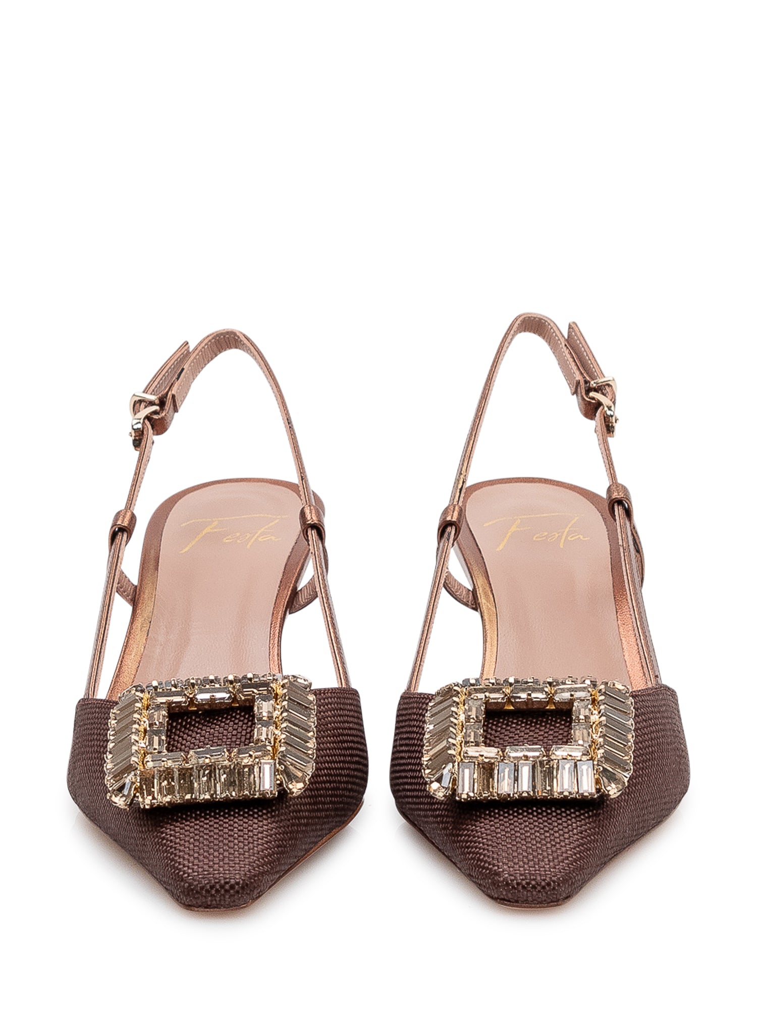 Slingback con punta affusolata, cinturini sottili e fibbia gioiello frontale. Tacco medio sottile.