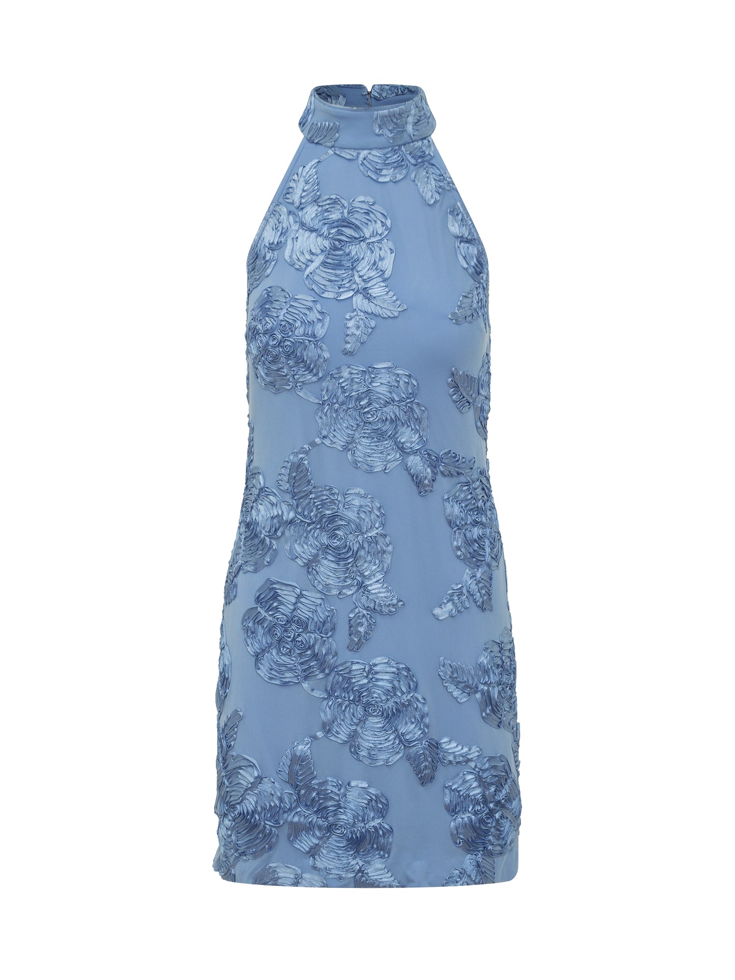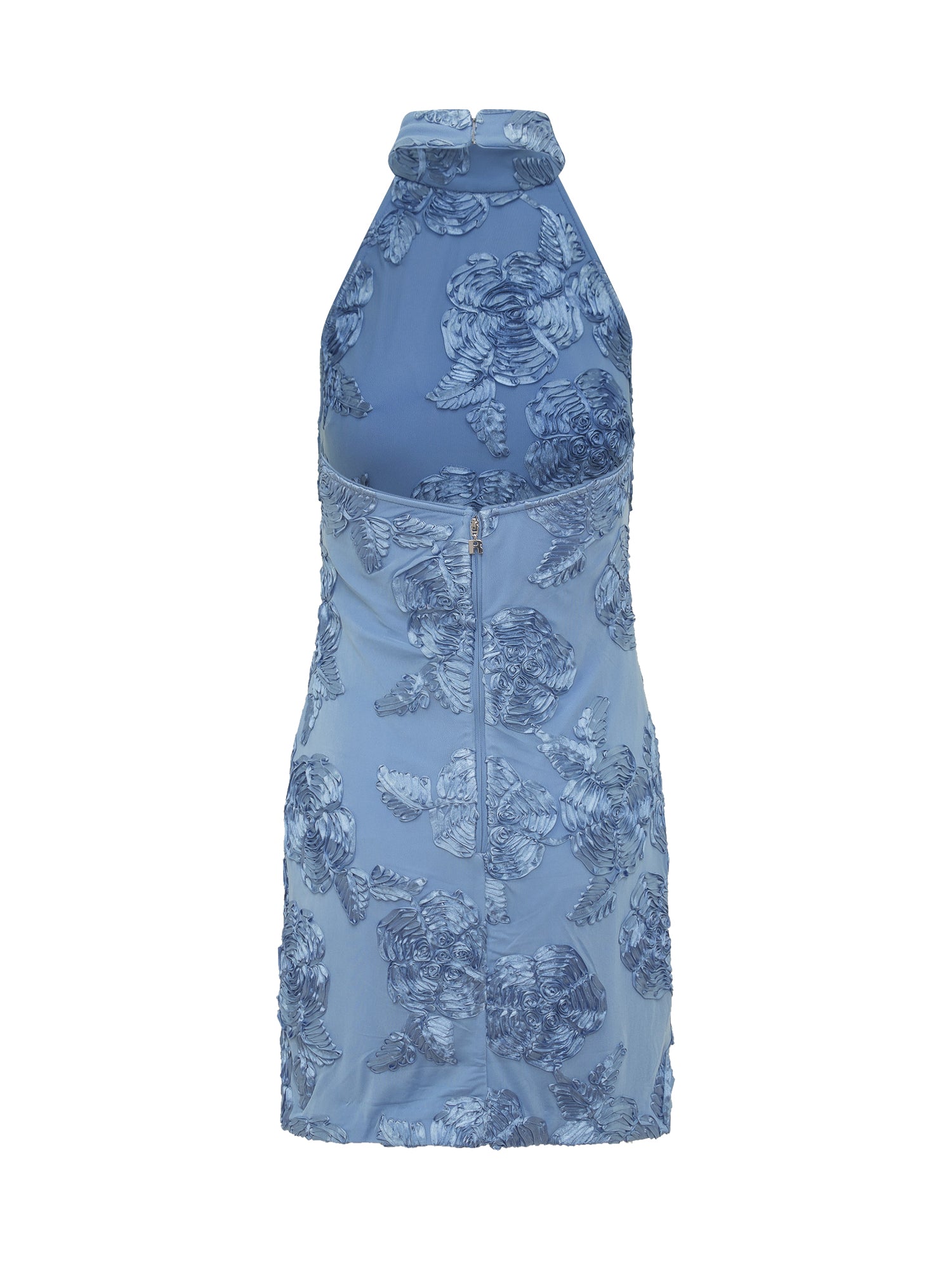 Abito halter con ricamo floreale tridimensionale che dona texture e raffinatezza. La silhouette aderente valorizza la figura.