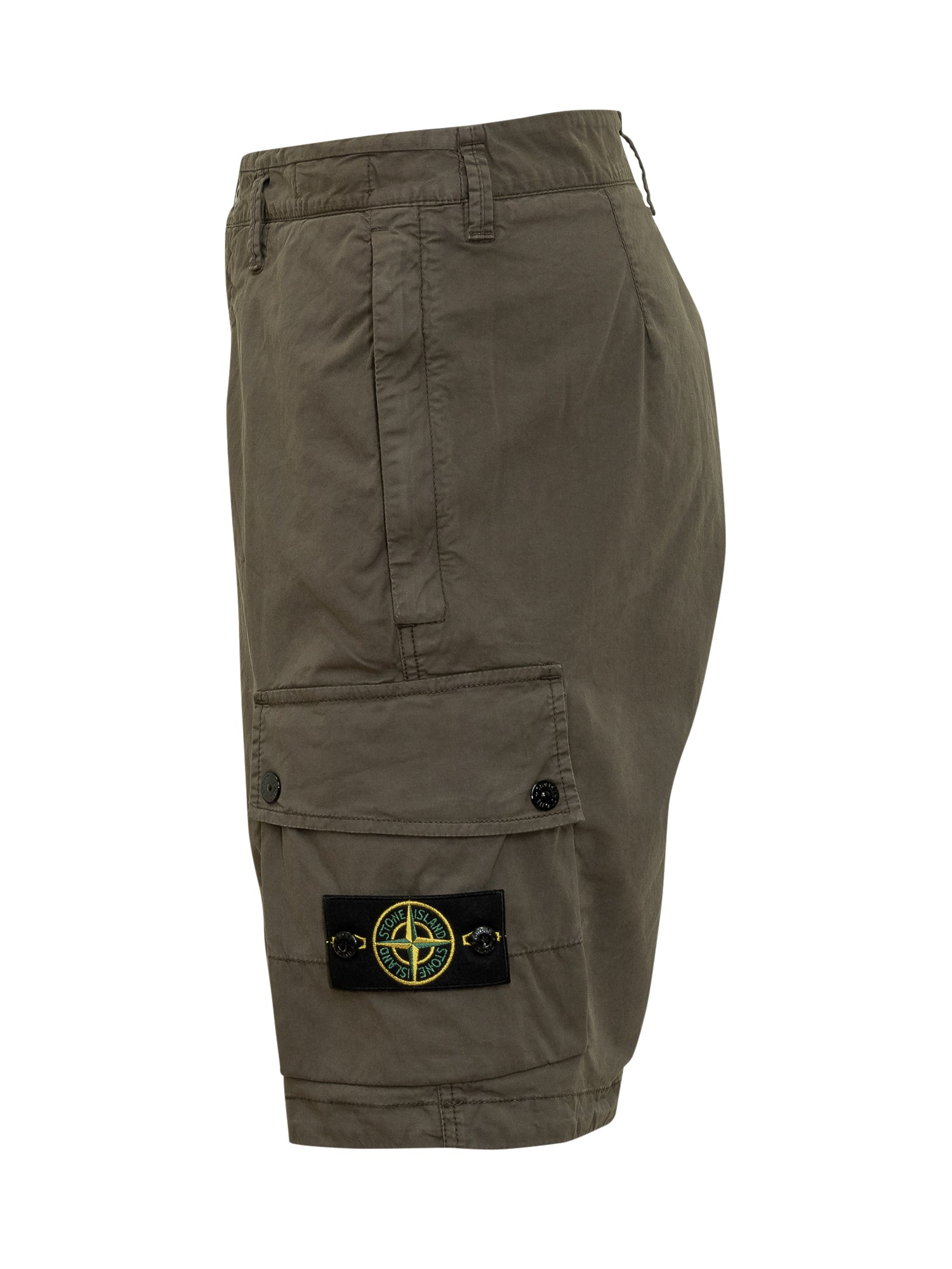 Short verde in cotone. Passanti per cintura. Cinque tasche. Logo Badge applicato. Chiusura con zip e bottone.