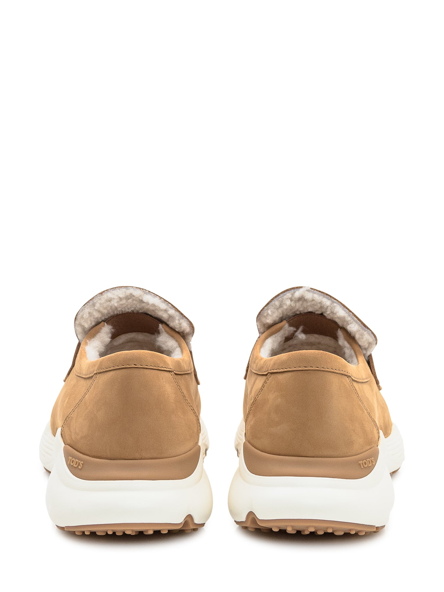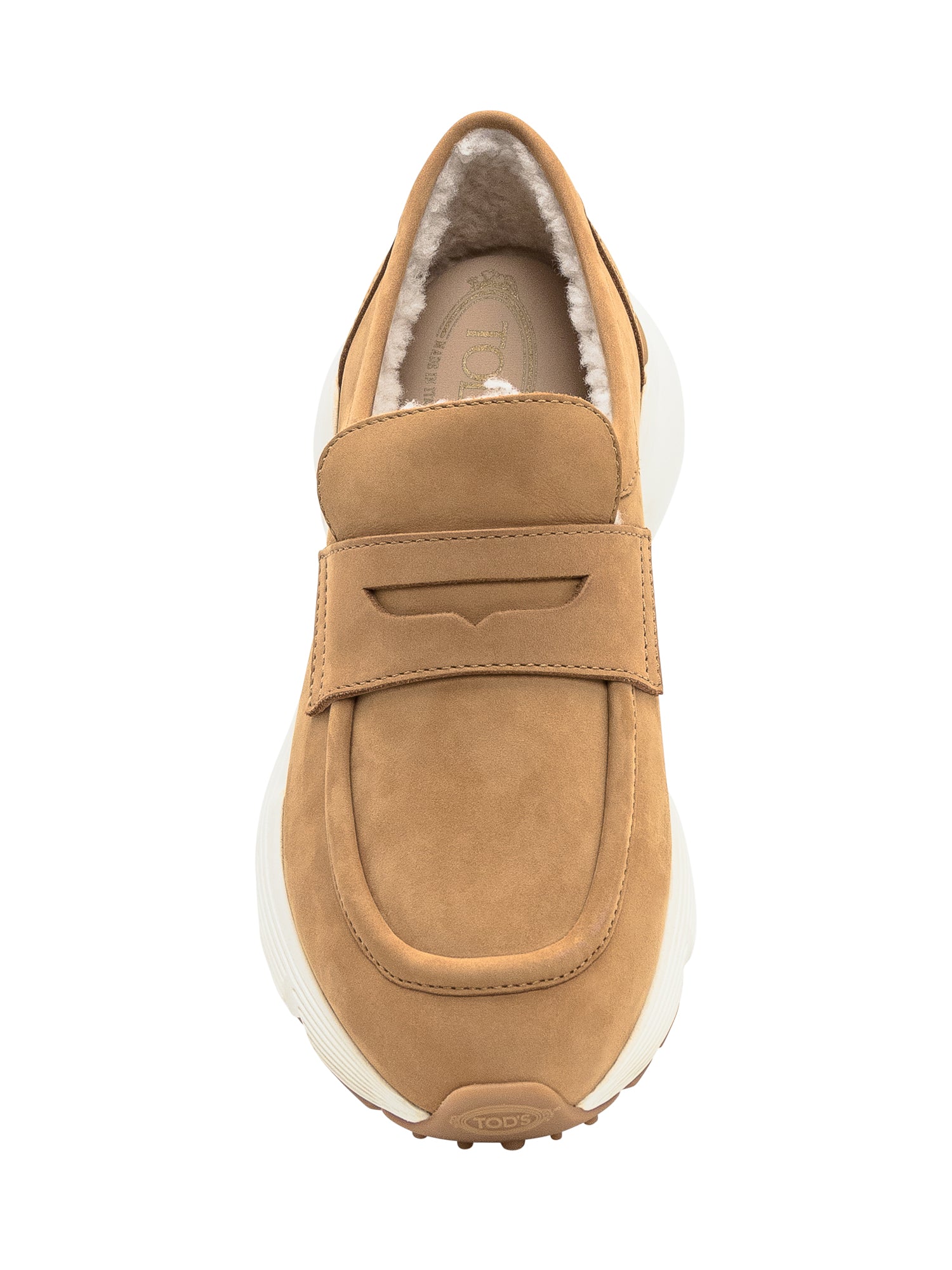 Mocassini Tod's in pelle scamosciata color camel con fodera interna in shearling e suola platform bianca a contrasto.