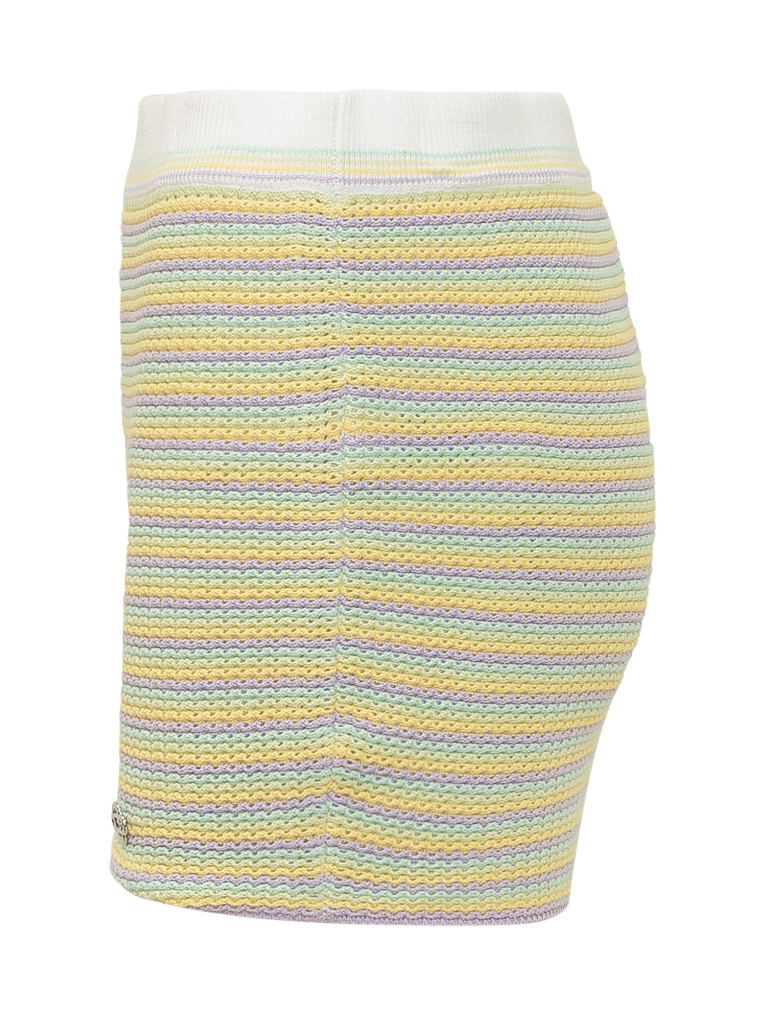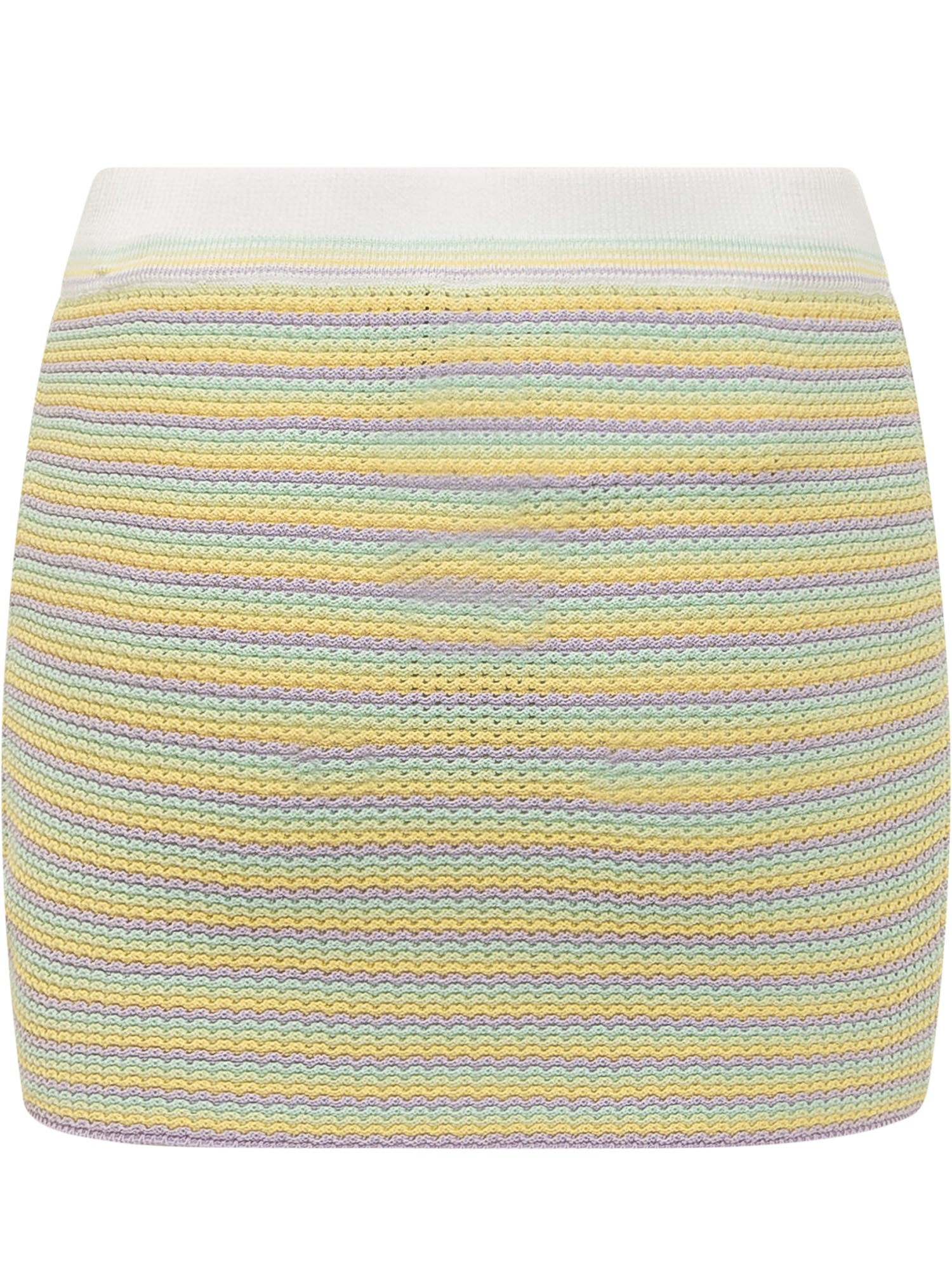 Minigonna con linea aderente, caratterizzata da motivo a righe orizzontali e lavorazione strutturata con logo applicato, design contemporaneo