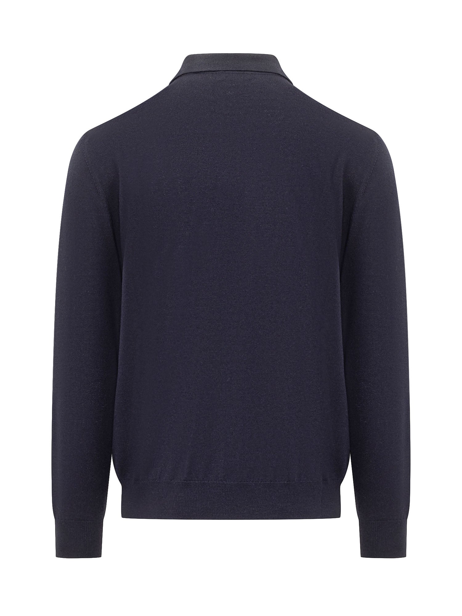 Maglia polo Etro da uomo in lana merino blu navy. Maniche lunghe, chiusura a tre bottoni, logo ricamato tono su tono.