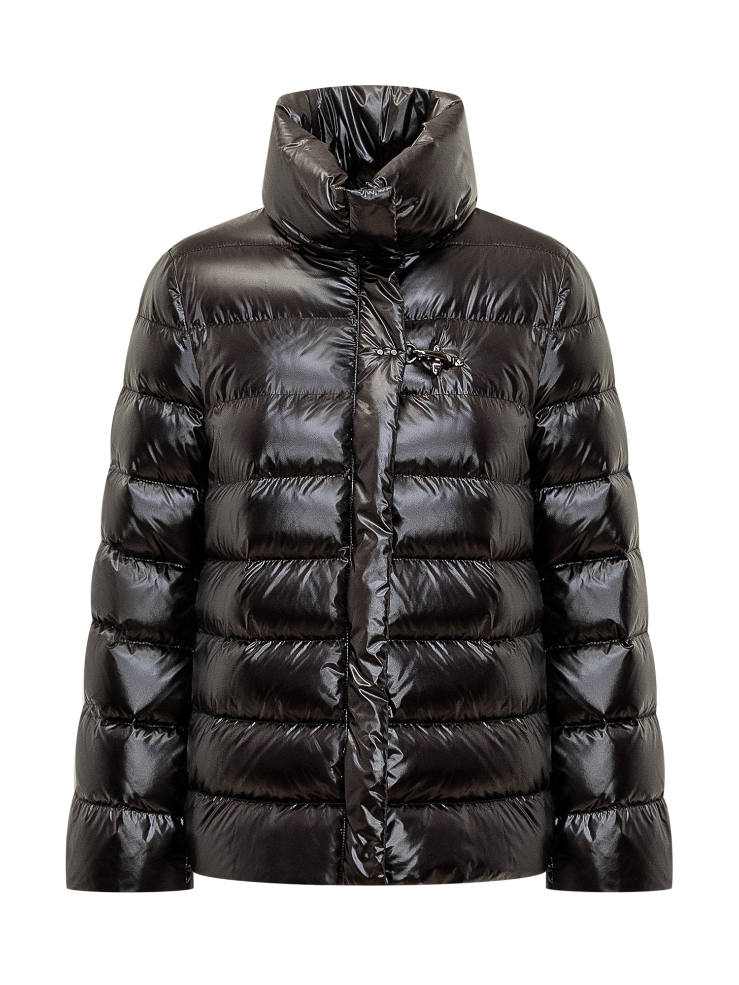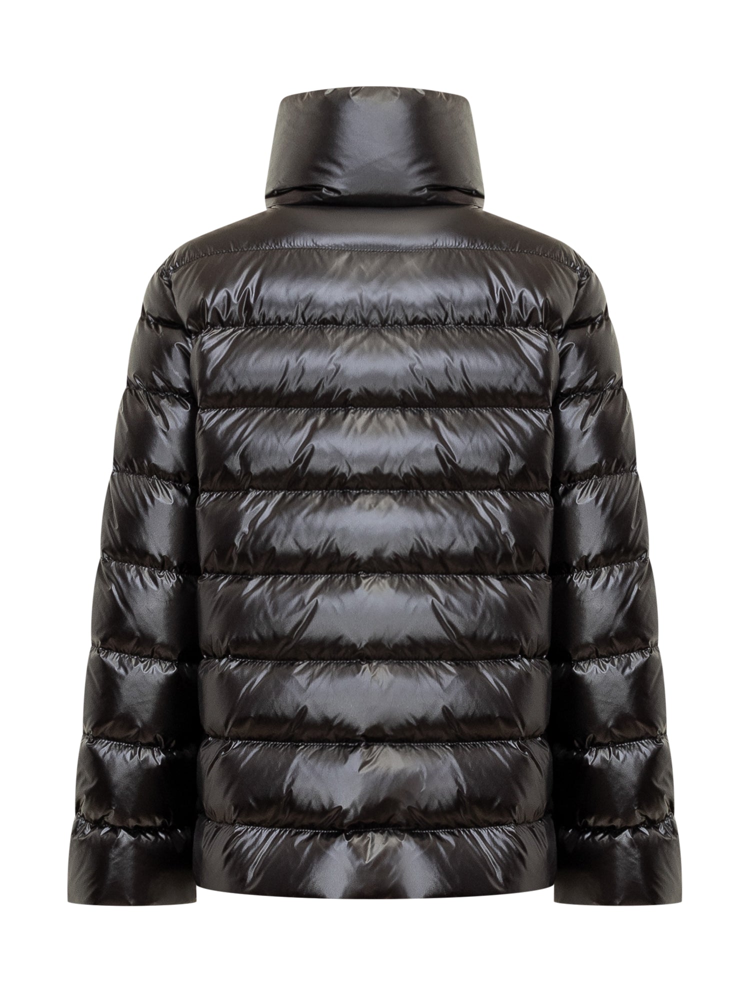 Piumino nero. Collo alto. Tasche sul lato. Chiusura con zip e gancio.