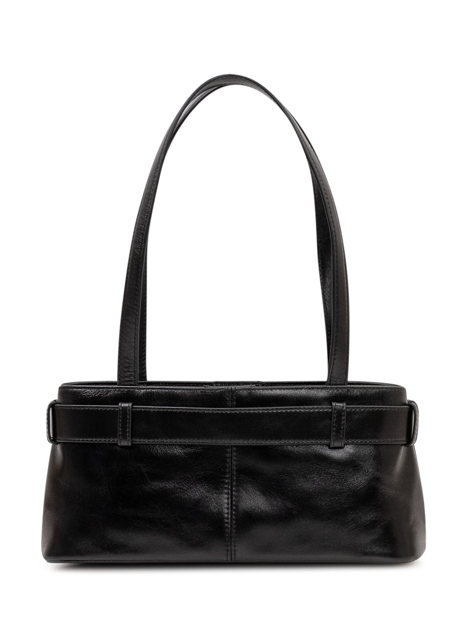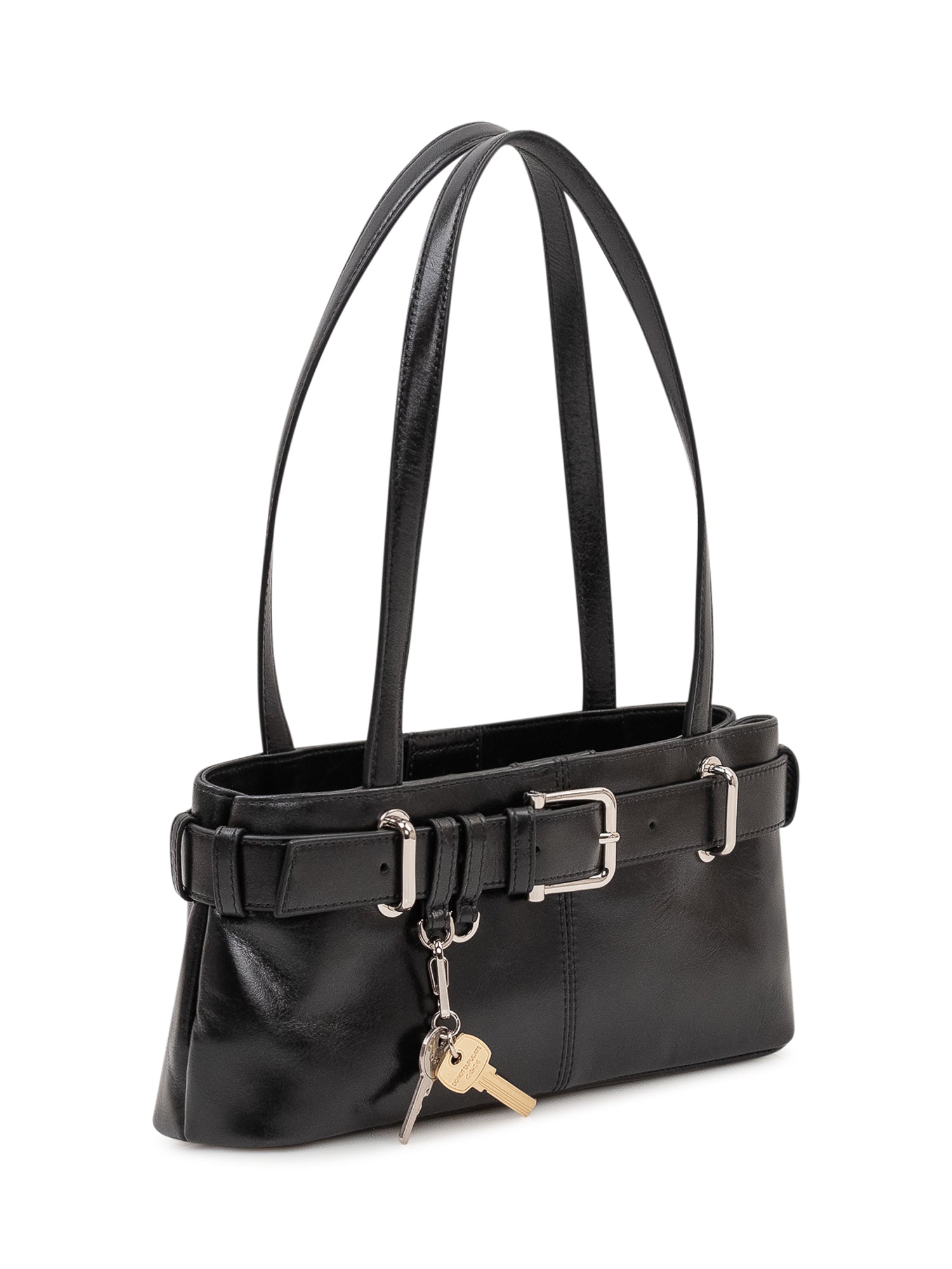Borsa a spalla in pelle dal design compatto con doppi manici lunghi. Caratterizzata da una cintura decorativa frontale con fibbia metallica e dettaglio portachiavi pendente. Modello elegante e contemporaneo, ideale per completare look quotidiani con un tocco sofisticato.