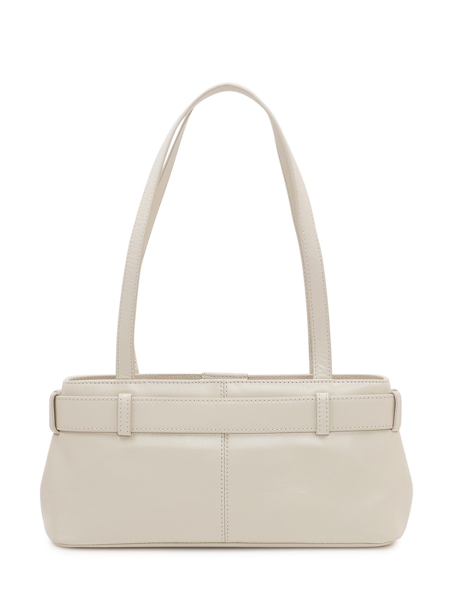 Borsa a spalla in pelle dal design compatto con doppi manici lunghi. Caratterizzata da una cintura decorativa frontale con fibbia metallica e dettaglio portachiavi pendente. Modello elegante e contemporaneo, ideale per completare look quotidiani con un tocco sofisticato.