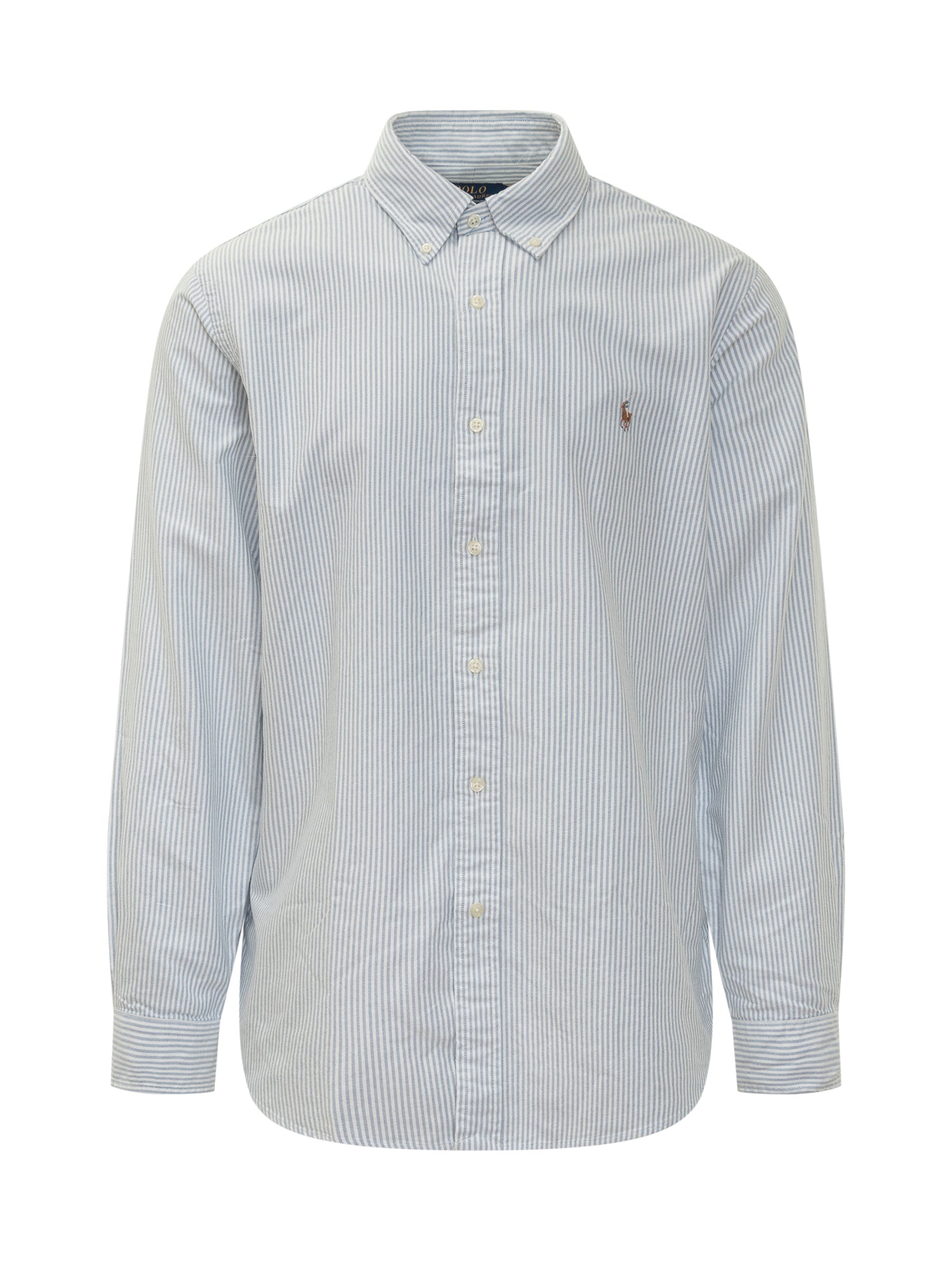 Camicia Polo Ralph Lauren in cotone a righe azzurre e bianche, con colletto button-down, chiusura a bottoni e logo ricamato sul petto.