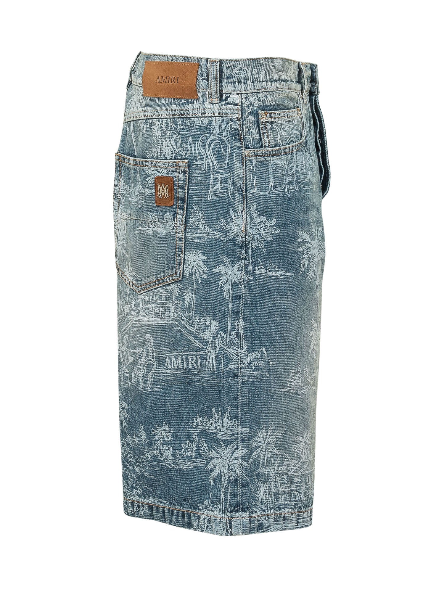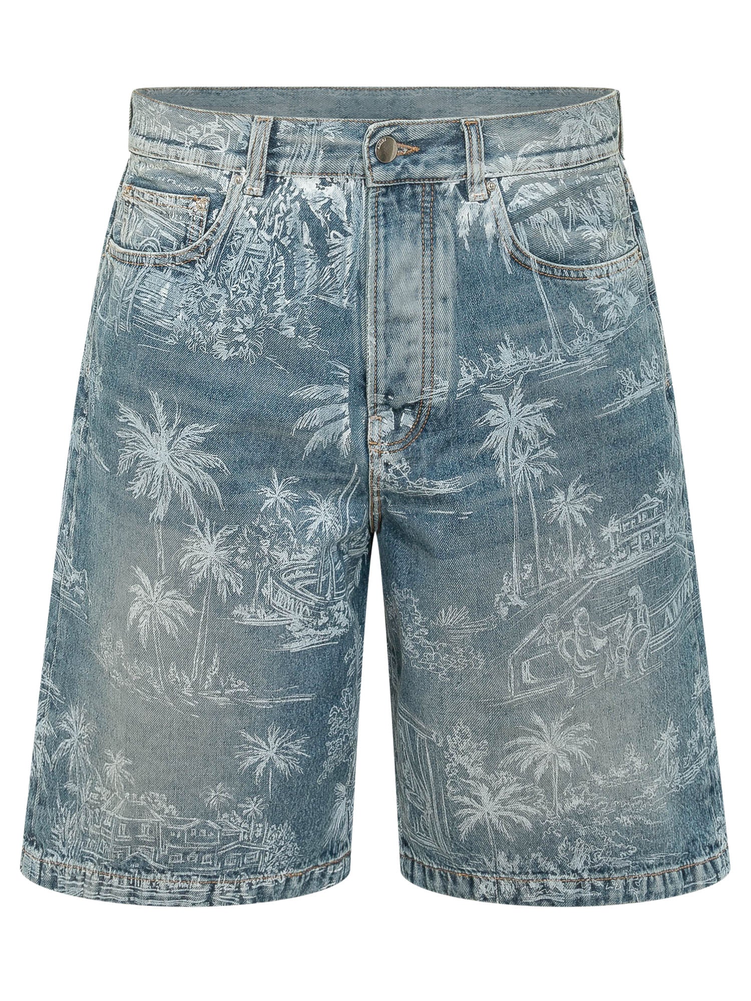 Shorts in denim con chiusura frontale con bottone e zip coperta. Modello a cinque tasche con passanti in vita e stampa paesaggio all over. Linea regolare con lunghezza sopra il ginocchio per look estivi distintivi.