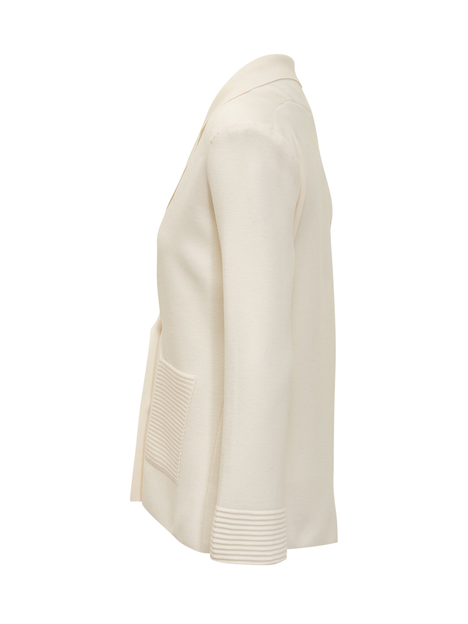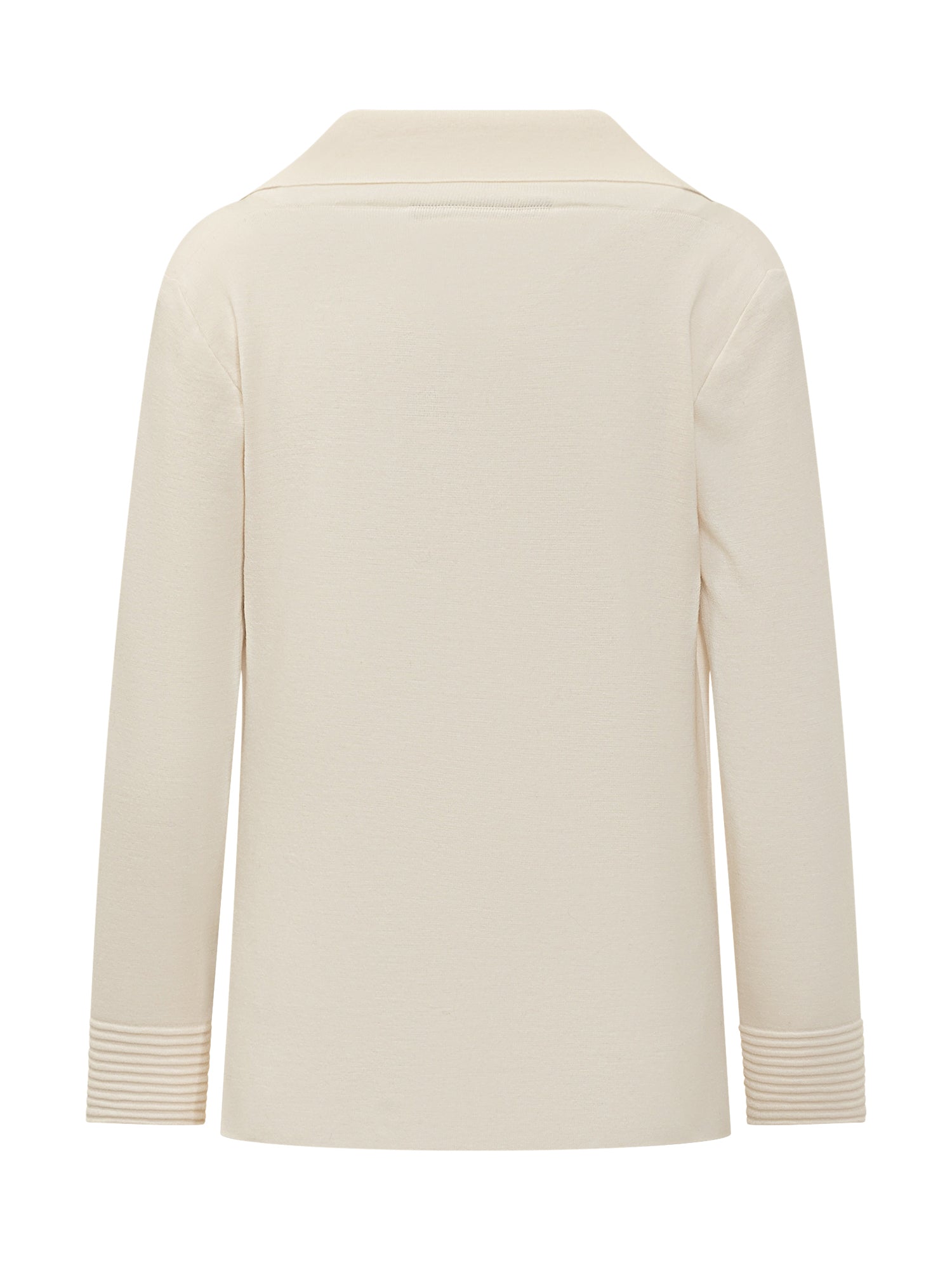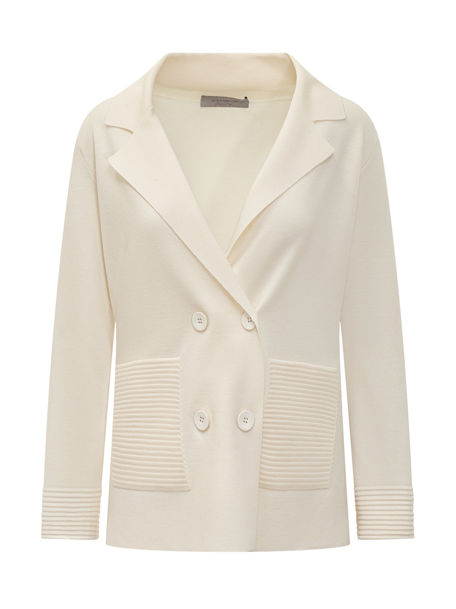 Giacca Exterior in maglia di merino con chiusura doppiopetto e tasche a costine. Elegante e confortevole, aggiunge un tocco sofisticato ai look quotidiani.