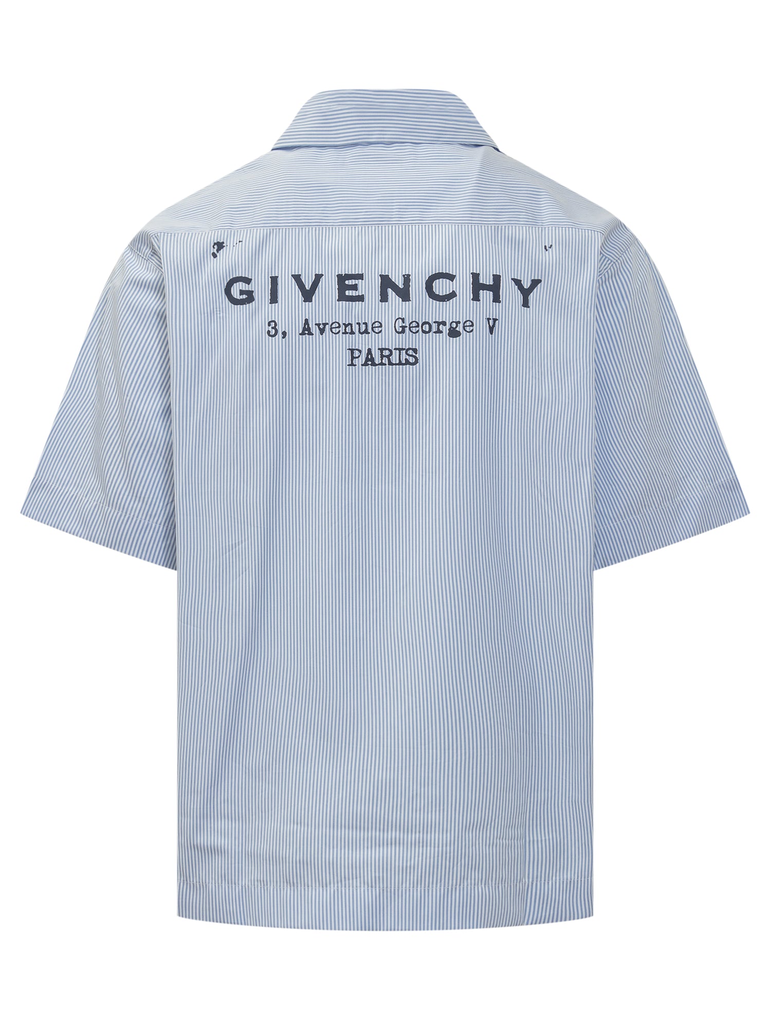 Camicia Givenchy a righe azzurre e bianche, a maniche corte, con colletto cubano e chiusura frontale a bottoni.